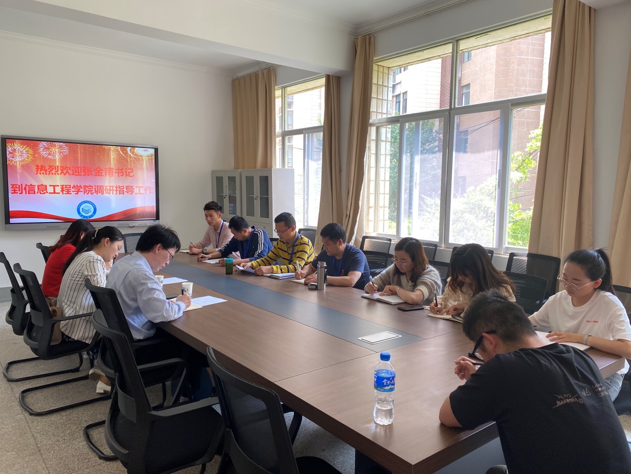 2021427日下午,学校党委书记张金甫、副校长严黄一仪和党政办副主任丁燕秋一行到信息工程学院调研工作。信息工程学院党政班子成员及行政坐班教师参加了调研会,从各个方面汇报了学院的建设发展情况。