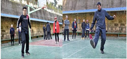 信息工程系系主任苏峥嵘老师与系部数媒班班主任常云刚老师参加学院教工队的踢毽子比赛。