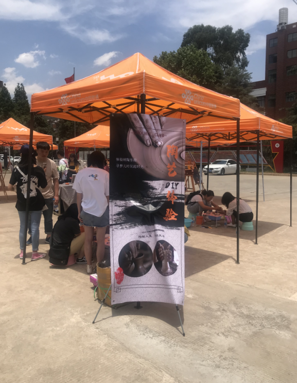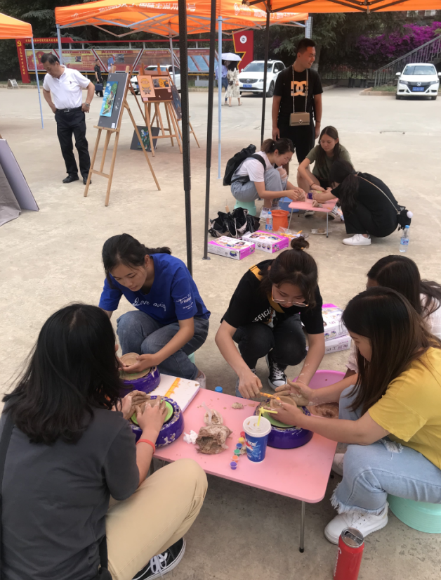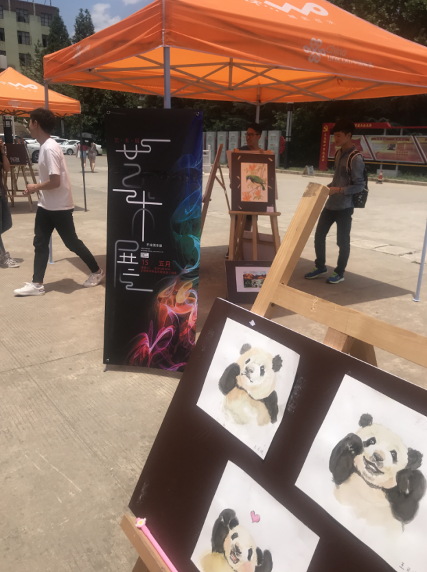 本次艺术展较往届不同的是新增了让参观的同学可以动手参与体验的环节(陶艺体验,一起创作爱国主题的画,签名墙等)。