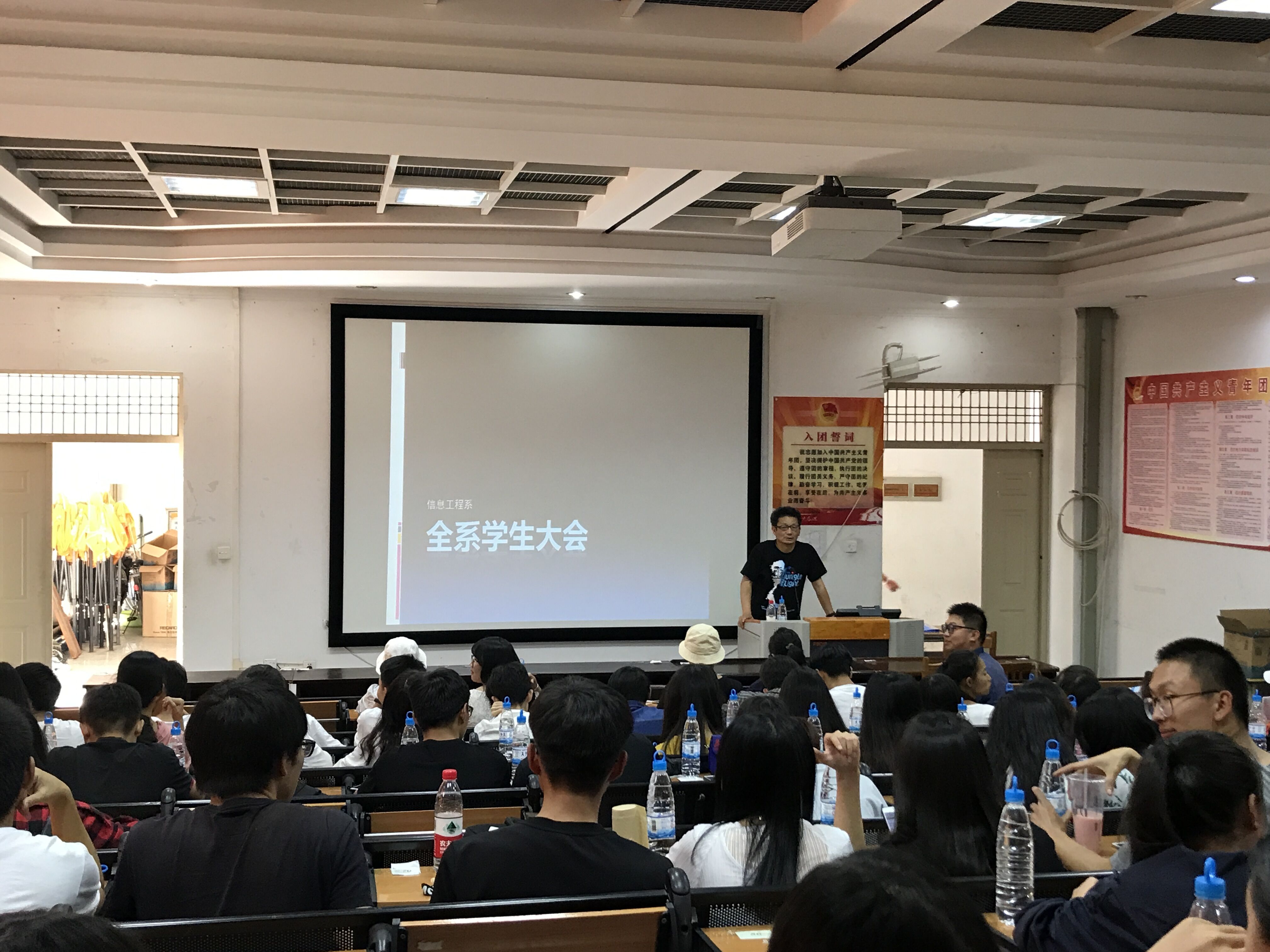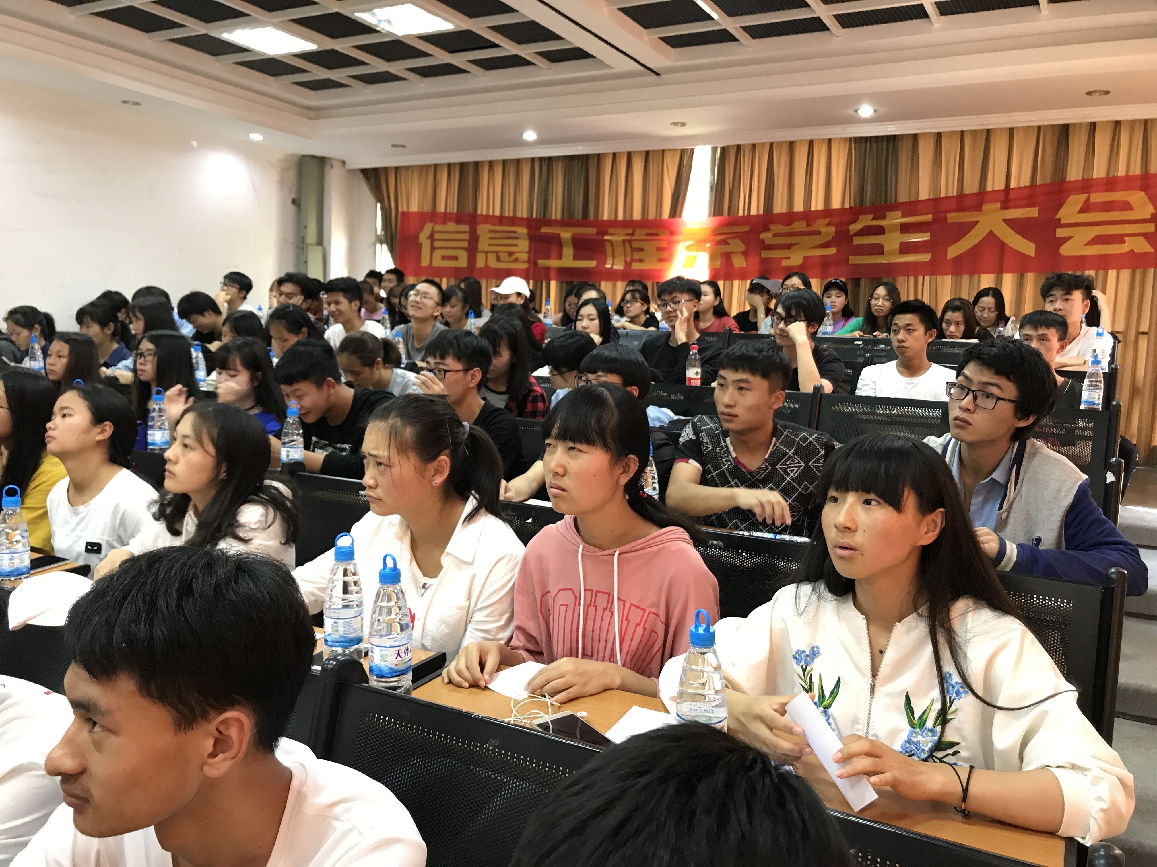 2018年6月6日,信息工程系在训导楼二楼202阶梯教室组织召开全系学生大会。会议上,系主任首先对近期我系在学校活动中取得的成绩进行了肯定:1、画展举办圆满成功;2、计算机技能大赛省赛一等奖并代表我省参加国赛;3、开幕式参演多项节目表现优秀;4、啦啦操比赛第三名……之后,针对本学期各班考勤情况对表现优秀的同学和缺旷较多的同学对比性进行了表扬和批评,并针对性地整顿了系部学风问题。