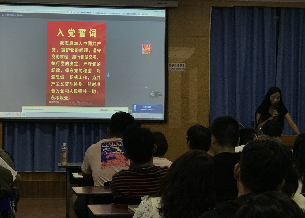 郁军老师由党的十九大“不忘初心、牢记使命”引出党员的宗旨——“全心全意为人民服务”,她通过分享自身入党经历,讲述自己的入党缘由,帮助全体同学树立正确的入党动机,她带领全体同学诵读党章,使同学对入党有了更加深刻的感情起点和认知起点。