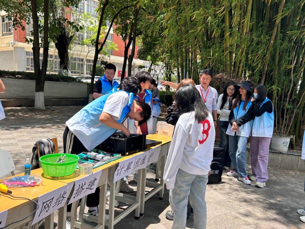 在数字化浪潮中,信息技术和网络安全已经成为我们日常生活不可或缺的一部分。为了提高师生的信息技术水平和网络安全意识,响应“职教周”的号召,在党支部的组织下,信息工程学院的志愿者们于2024年5月17日在育德楼前举办了计算机维护志愿服务活动。