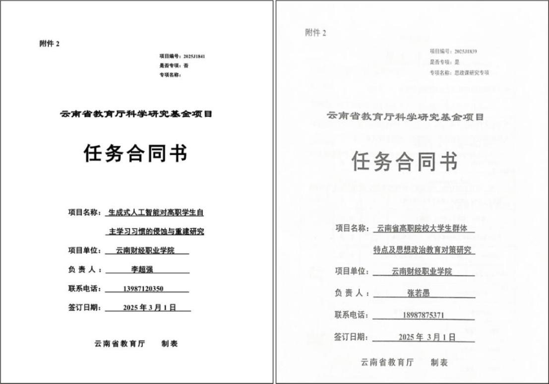 近日,云南省教育厅2025年度科学研究基金项目评审结果揭晓,云南财经职业学院信息工程学院申报的《生成式人工智能对高职学生自主学习习惯的侵蚀与重建研究》《云南省高职院校大学生群体特点及思想政治教育对策研究》两项课题成功获批立项,为学院科研工作再添新突破。