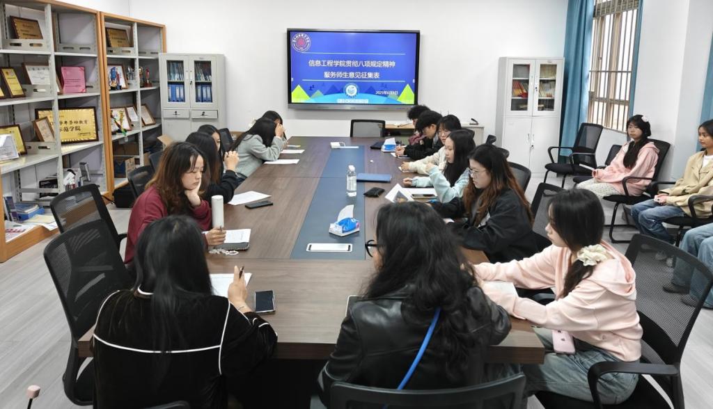 为深化中央八项规定精神落实,推动学院作风建设与服务效能双提升,6月3日,信息工程学院在育德楼108会议室召开“八项规定”精神贯彻暨服务师生意见征集专题会议,学院师生代表参会。