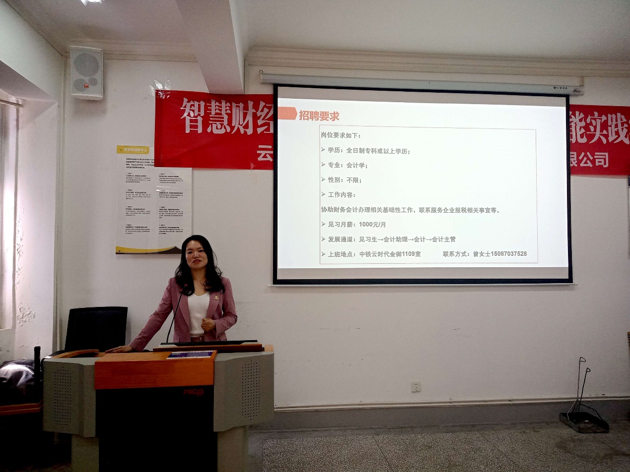招聘会上,雄企财税、昆明凸凹企业管理有限公司、云南耘慧智樽企业管理有限公司、云南浩邦财务有限公司分别就公司基本情况、规模、主营业务、用人需求、薪资待遇进行了介绍,并就参会学生关心的实习期、绩效业绩考核等问题作出解答。