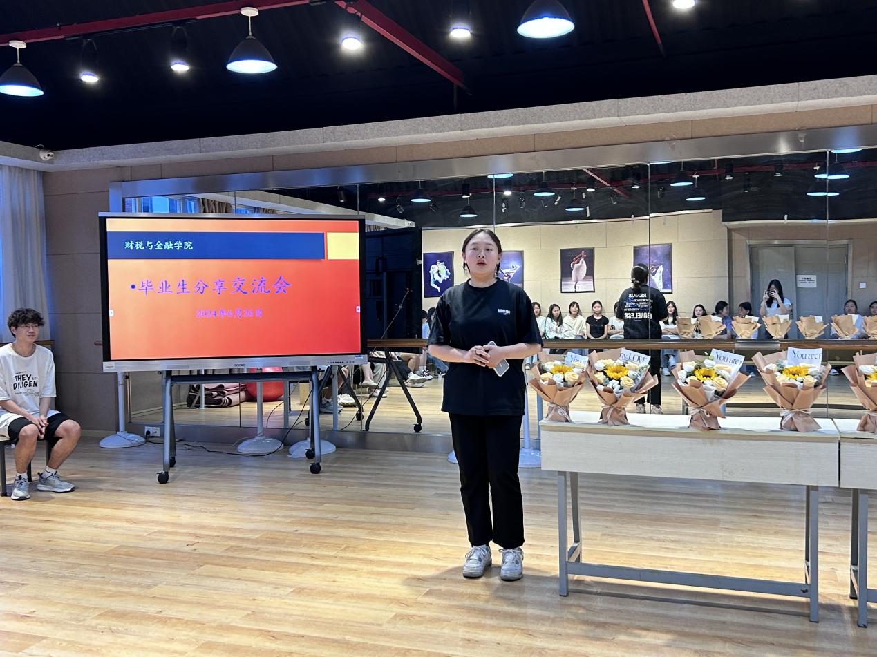 2024年6月26日晚,财税与金融学院在敬德楼301形体房举行了一场简单朴素的毕业生分享交流会,本次分享会由学院团总支副书记、学生会主席陈应达主持。学院党支部副书记方爱莲,2024届毕业生代表及龙泉校区各班代表、学生会成员参加本次交流会。本次活动邀请了在校期间表现突出的毕业生,通过他们的分享和经验传授,给大一、大二的学弟学妹们提供启发和指导。