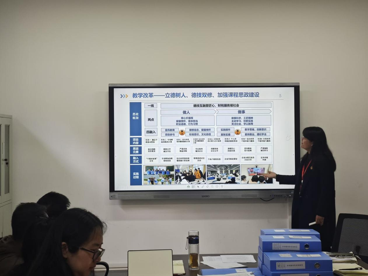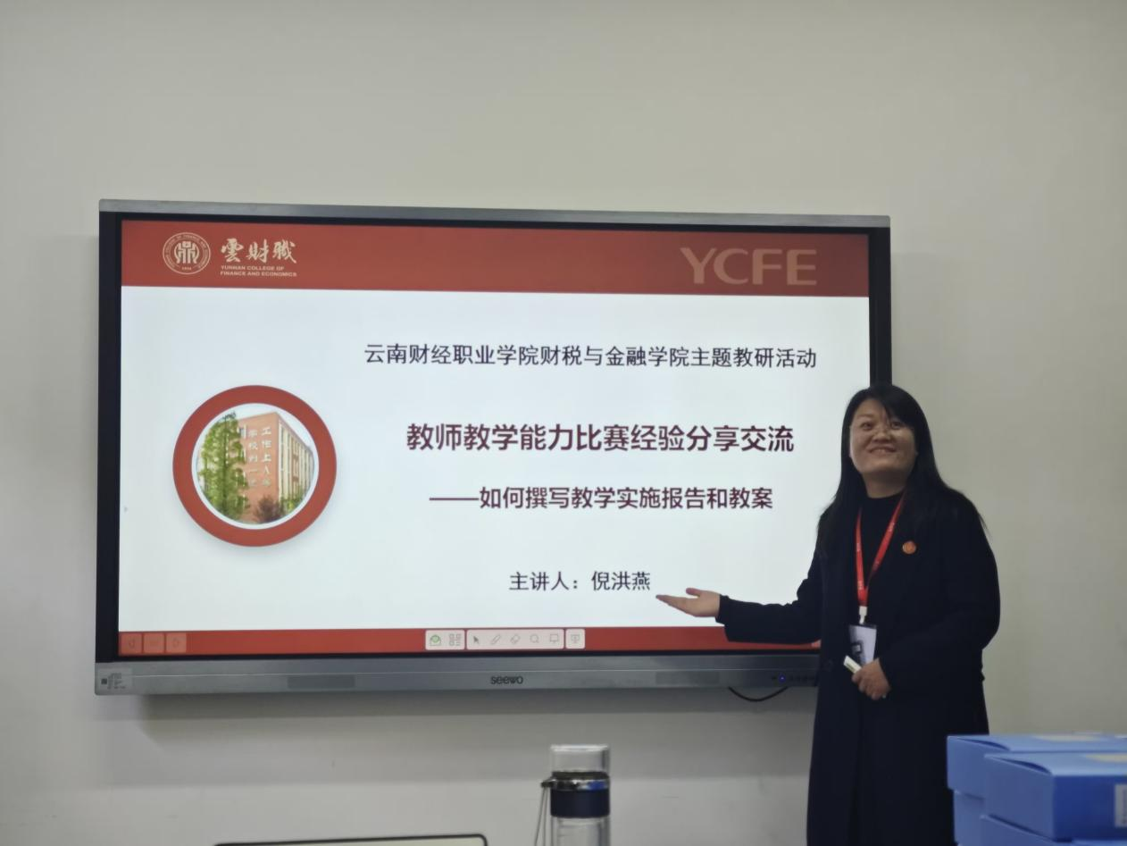 财税大数据应用专业带头人倪洪燕进行教师教学能力比赛经验分享交流,重点讲解了如何撰写教学实施报告和教案,倪老师以自身丰富的参赛经验为基础,从选题策划、教学设计、课堂展示到团队协作等多个维度,毫无保留地分享了在教学能力比赛中积累的宝贵经验与实用技巧。她深刻剖析了“以赛促教、以赛促学”的核心理念,强调比赛不仅是教师个人教学风采的璀璨舞台,更是推动教学改革向纵深发展、提升课程整体质量不可或缺的强劲动力。倪老师的分享干货满满,引发了参会教师的强烈共鸣和热烈讨论。