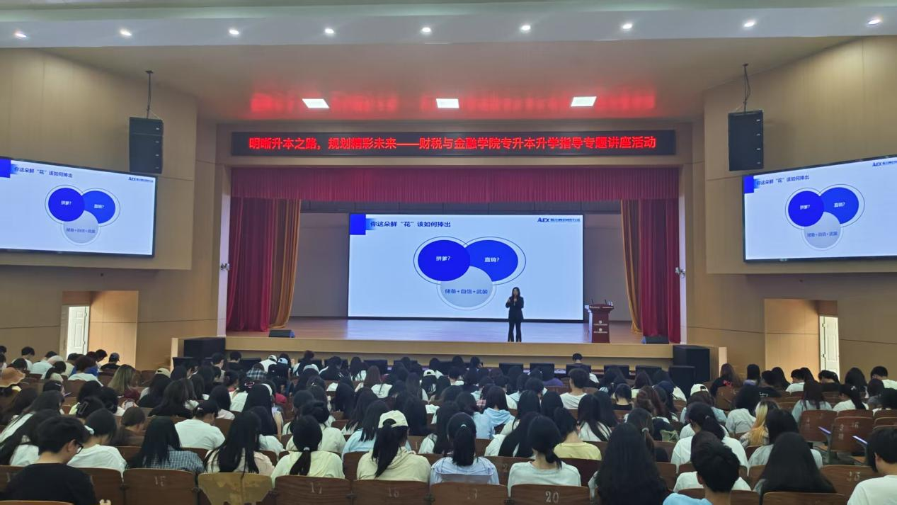 为加强学风建设,聚焦学生所需,切实为学生办实事、解难题,财税与金融学院党支部、团总支结合当前同学们面对专升本备考的诸多困惑,邀请爱尔信中润学院专升本事业部教学总监、考研事业部运营总监常雪,于4月24日下午在大观校区大礼堂为同学们带来“明晰升本之路,规划精彩未来”专升本升学指导专题讲座。讲座为备战专升本的广大同学清晰讲解了当前专升本政策与情况,帮助同学们做好学习规划,积极备战考试。