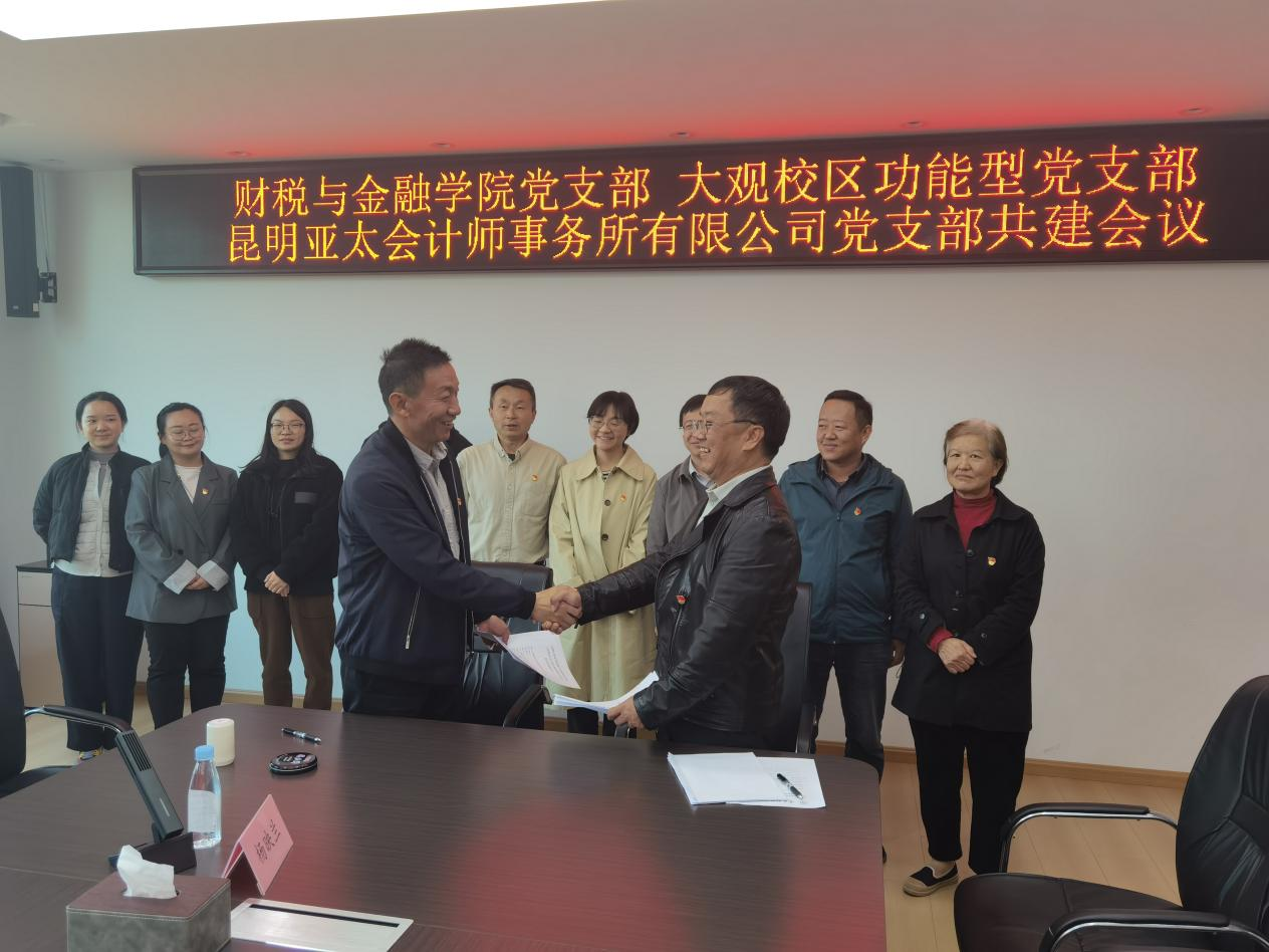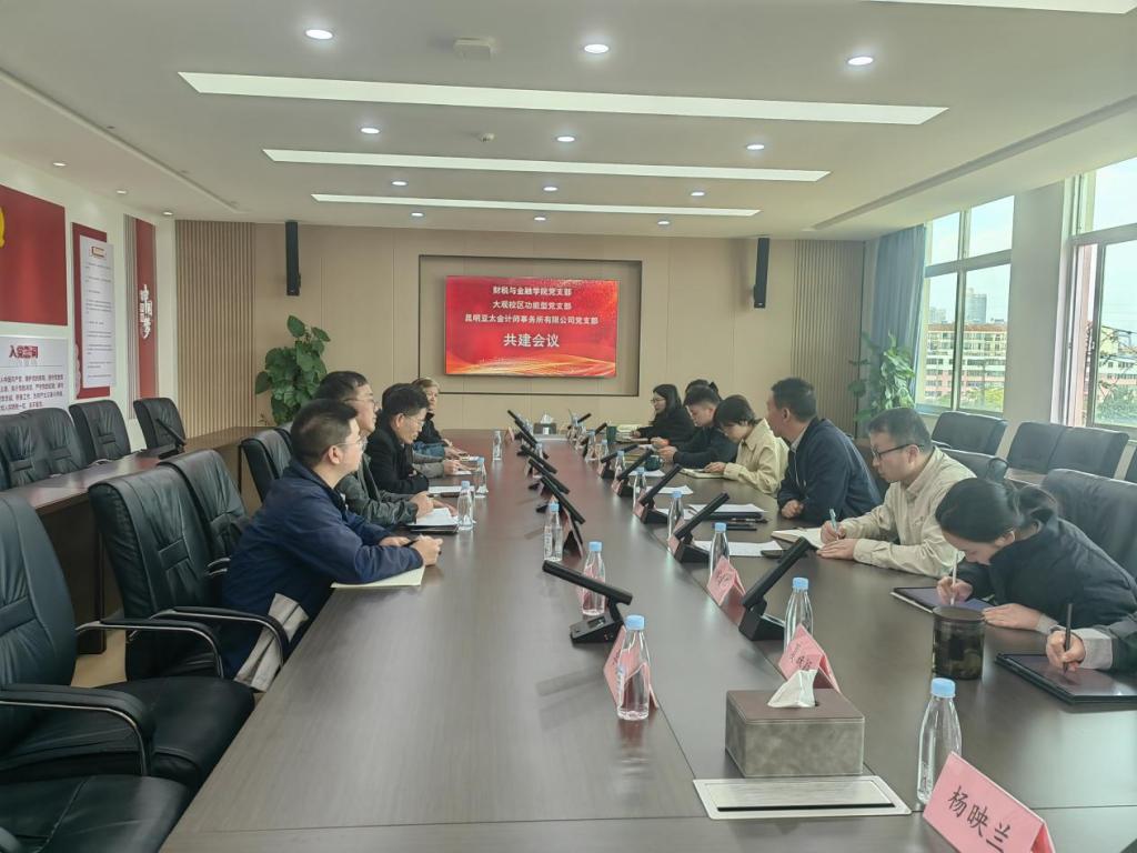 为深入学习贯彻习近平新时代中国特色社会主义思想,充分发挥基层党支部战斗堡垒作用和党员先锋模范作用,推动党建工作与业务发展深度融合,10月24日,财税与金融学院党支部、大观校区功能型党支部与昆明亚太会计师事务所有限公司党支部联合开展共建活动。