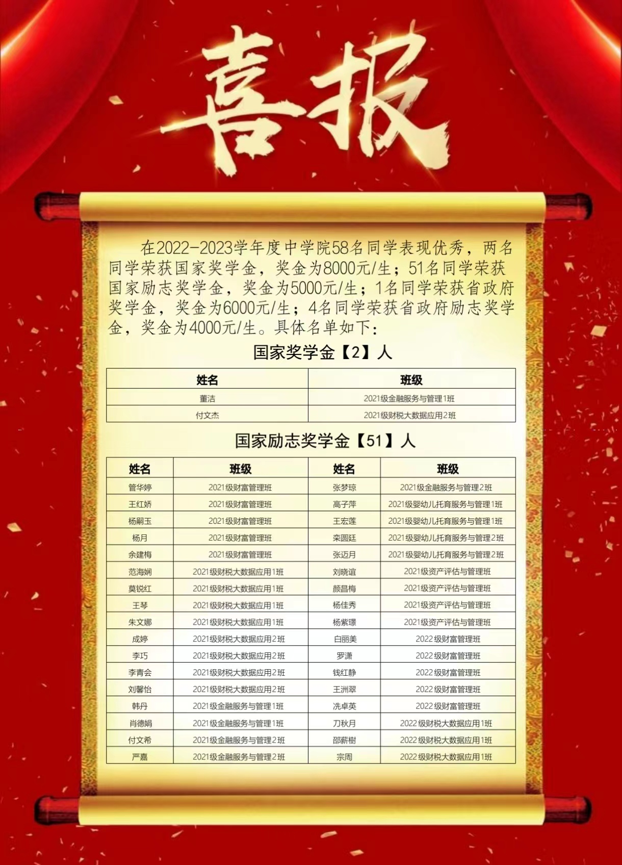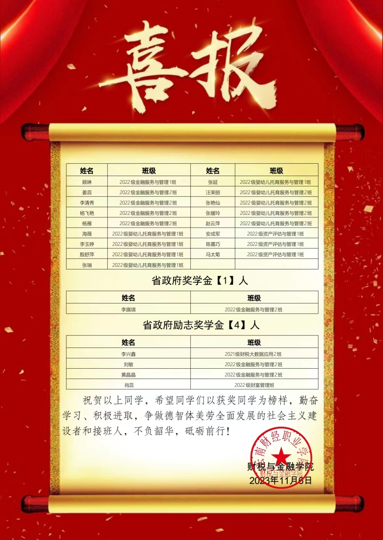国家奖学金、国家励志奖学金、省政府奖学金、省政府励志奖学金喜报!