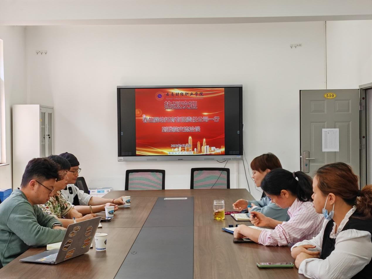 为深化产教融合改革,推进职业教育发展,2023年4月10日下午2:30分,春生婴幼托育(云南)有限责任公司及复兴托育有限责任公司一行到财税与金融学院就现代学徒制人才培养模式进行交流洽谈。座谈会在敬德楼510会议室召开,由学院副院长杨雯婷主持,春生公司总园长汪志翔复兴托育负责人肖明美、学院党支部副书记方爱莲、婴幼儿托育服务与管理教研室教师陈湘及托育公司相关负责人参加会议。