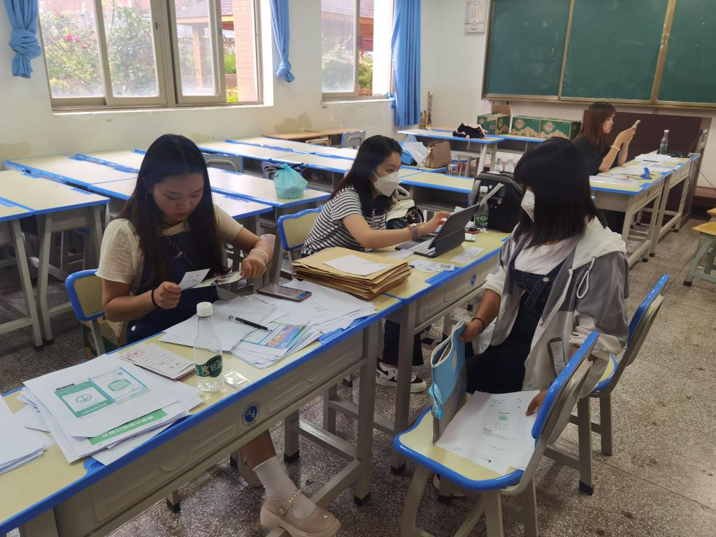 新生班辅导员和班导一早就在接待点等待同学们的到来,认真登记同学们的信息,合理安排宿舍,第一次的师生见面充满了温馨问候和欢声笑语。