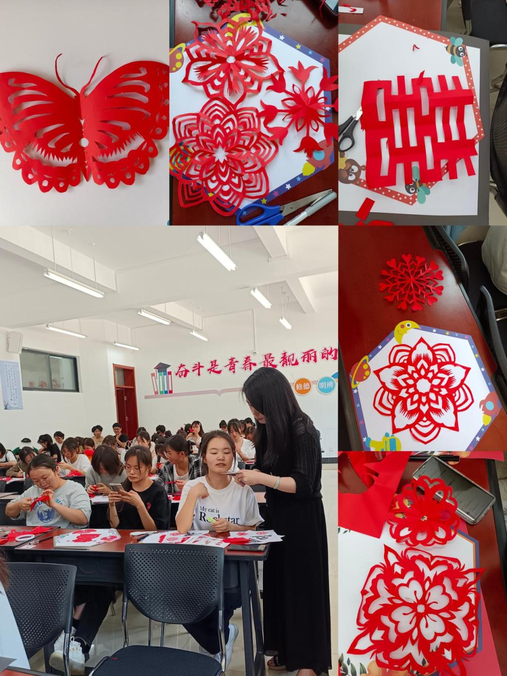 现场气氛活跃,同学们积极参与还有专业的老师授课,让同学们更加深入了解非遗文化。课堂上,老师给学生讲述剪纸历史、剪纸工具、剪纸特点及剪纸基本制作方法,引导学生初步了解剪纸艺术,掌握剪纸的基本知识,并利用剪纸作品示范剪刻和装裱,让学生掌握基本技巧,积极创造和装饰自己的纸艺制作。