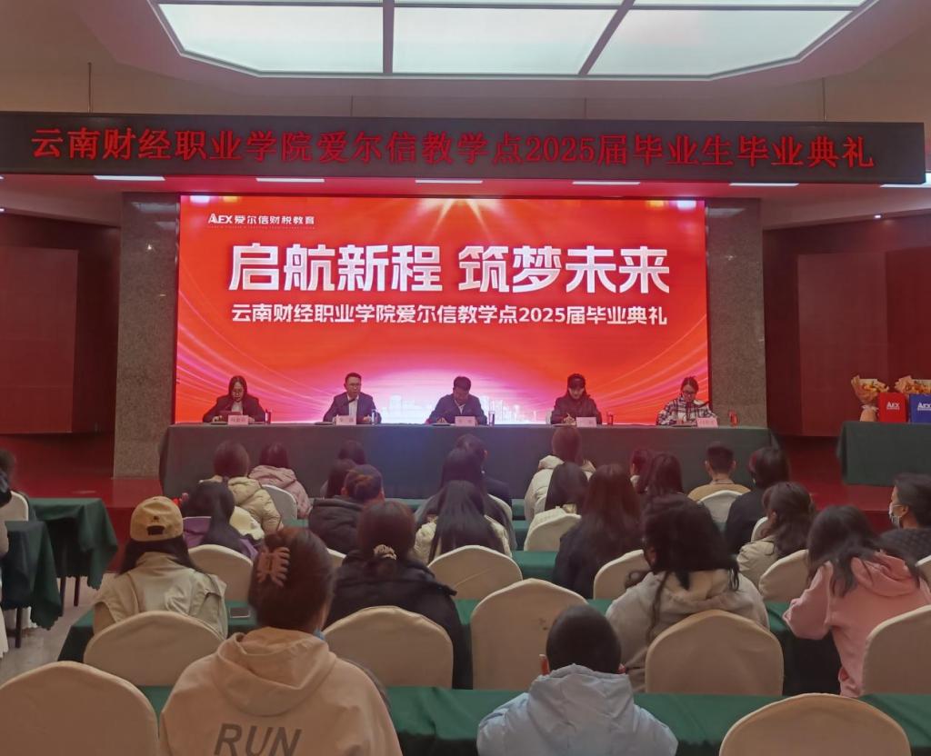 2025年3月16日上午,云南财经职业学院高等学历继续教育2025届毕业典礼在校外教学点爱尔信总部二楼报告厅举行,本次毕业典礼采用线上加线下的形式同步进行。学校副校长李雄、继续教育学院负责人、爱尔信集团执行总裁、 爱尔信产业学院校长余强、爱尔信股份财税教育副校长刘金花及383名毕业生参加本次典礼。