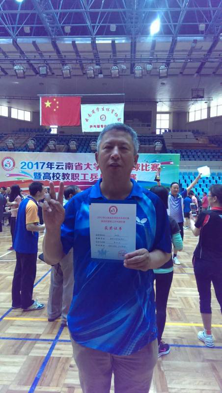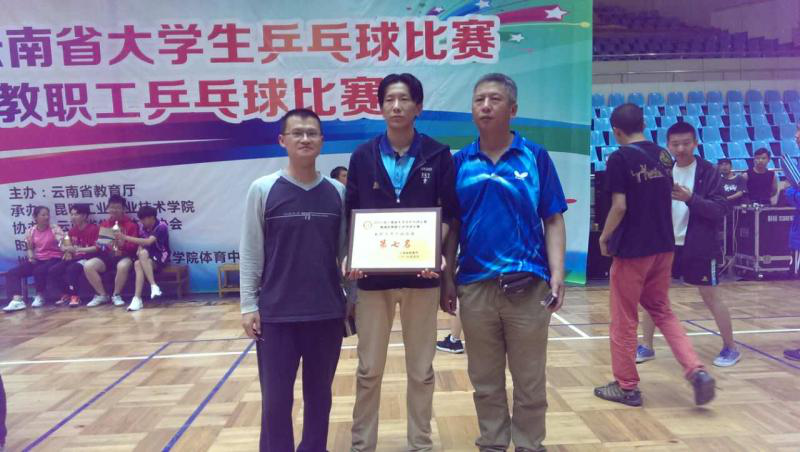 获得乒乓球冠军的和医生以及我校参加比赛的老师]