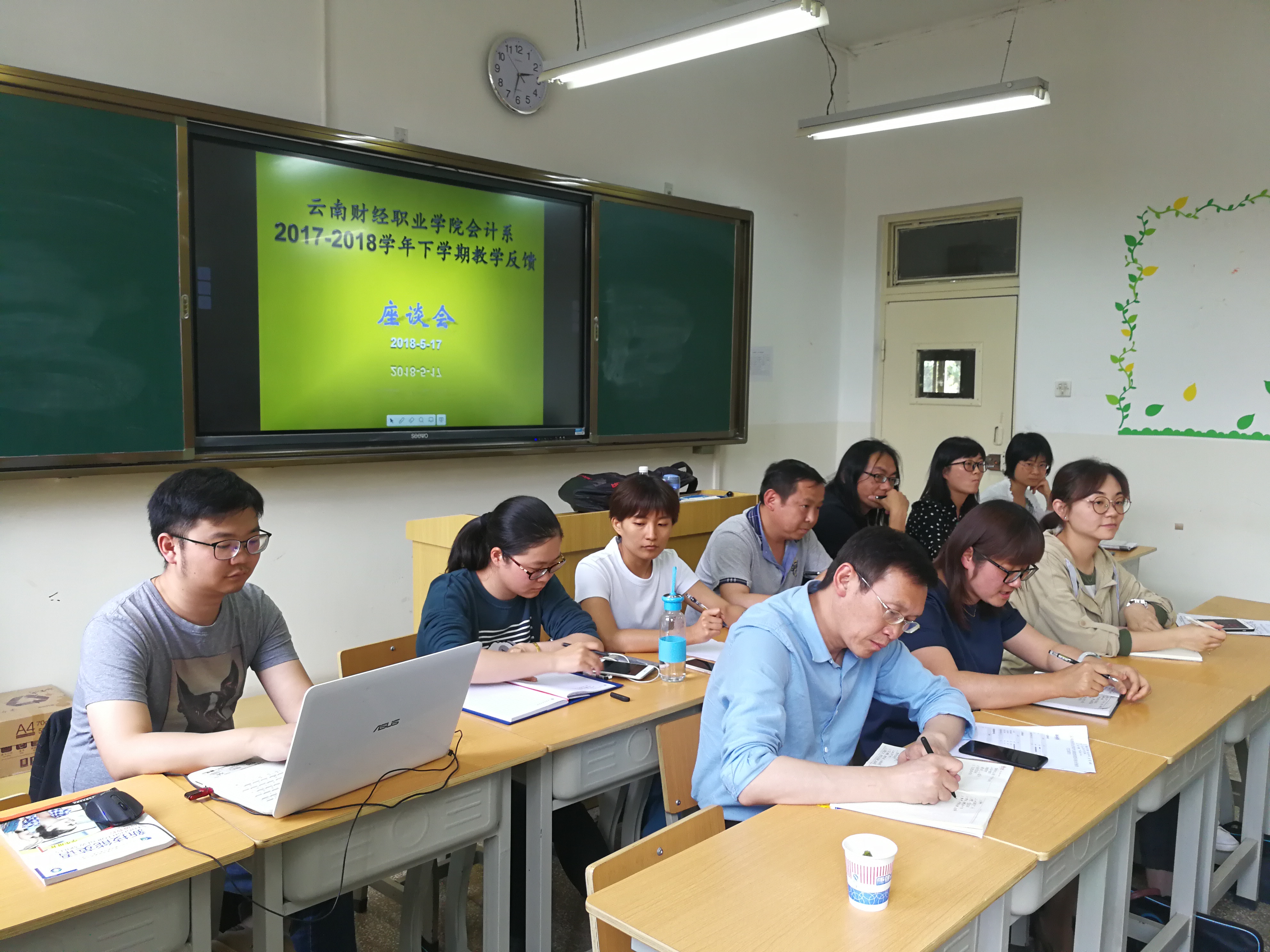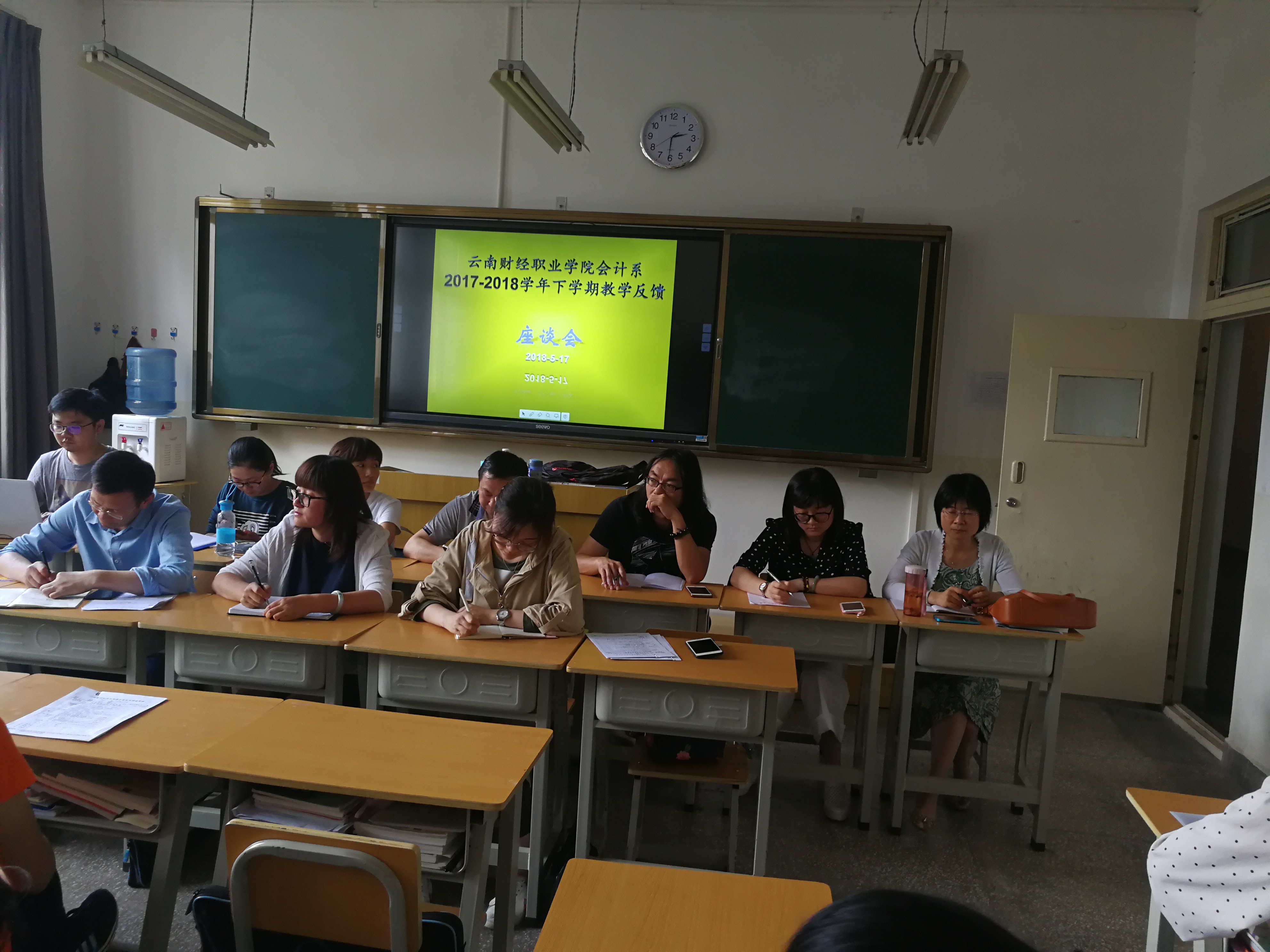 2018年5月17日下午14::30分,会计系在教学楼206教室举行了2017-2018学年度下学期教学反馈意见座谈会,参加会议的有:会计系主任尹湘萍、副主任曾浩、会计系杨雯婷书记、会计系教研主任胡悦晖、查小金、徐沉和吴娟老师,主任助理高秋元老师,负责日常教学管理工作的钟希君老师、辅导员张苗苗、山云松和禄怡老师以及16级、17级各班班长或学习委员。