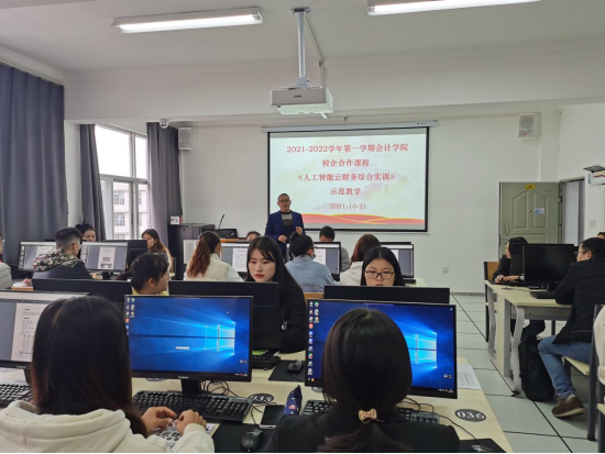2021年10月21日下午13:20分,由会计学院杨雯婷副院长主持,全院教师一起参加“人工智能云财务实训”的示范课及宣讲活动,参加此次实训的还有部分选修学生。