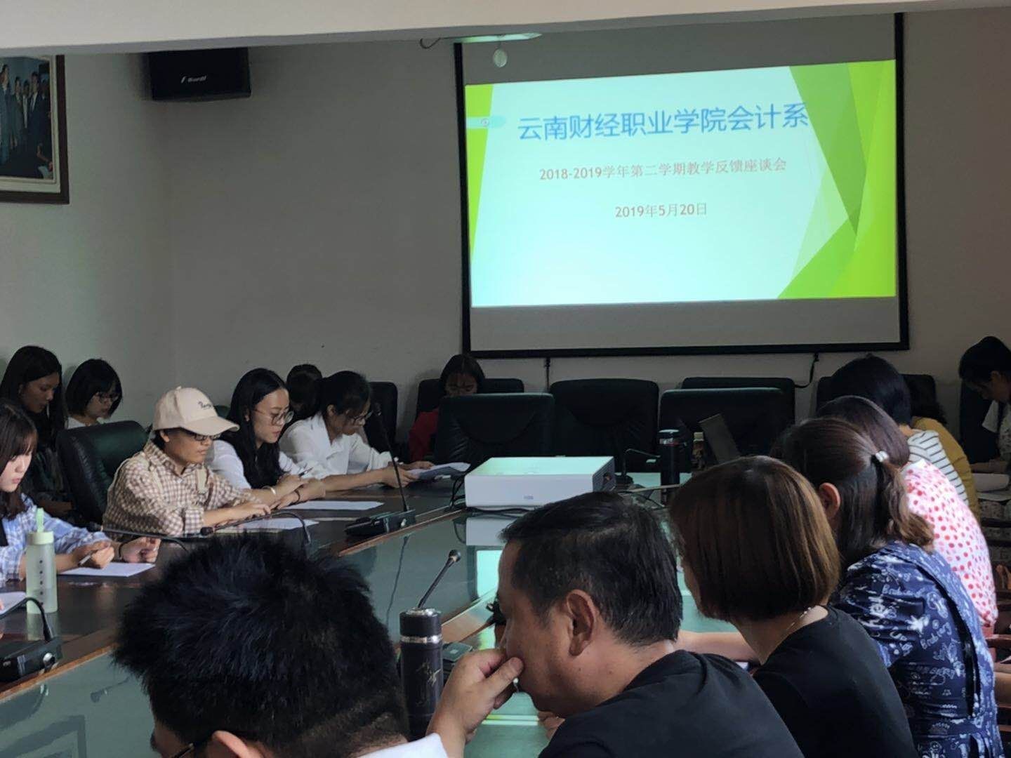 为了提高教育教学质量,完善教学成果,云南财经职业学院会计系于2019年5月20日在云南财经职业学院第一会议室召开2018-2019学年度第二学期期中工作反馈会。会议由会计系书记杨雯婷老师主持,参加人员有:会计系主任尹湘萍老师,会计系副主任、云南云岭教师曾浩老师,会计系教学秘书徐飞老师,会计系四位教研室主任胡悦晖老师、查小金老师、徐沉老师、吴娟老师,会计系36个班学生代表。