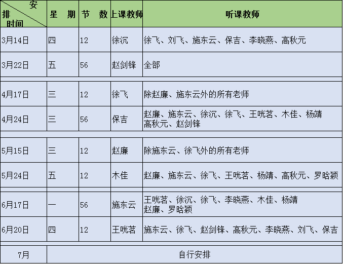 (七)组织骨干教师继续开展对青年老师的传帮带工作。杨靖、刘飞指导教师为徐飞,罗晗颖指导教师为徐沉。青年教师做到随堂听课,并做好相关笔记。指导教师对青年教师教案、教学组织、实际教学活动等进行检查。