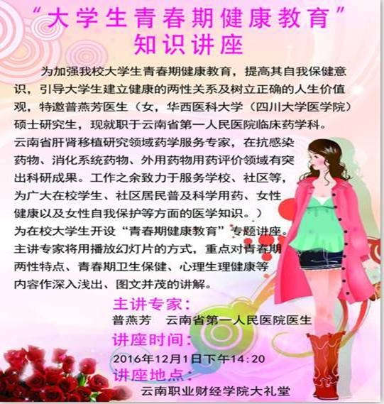 “开始了吗?”“已经结束了!”这是我们很多人都听过的一句广告词。生理健康教育是学校基础教育的重要组成部分,也是学校素质教育的重要内容。当代,已不再是一个“谈性色变”的年代,因此,对大学生的性知识,性心理,性价值和性道德教育的普及是大学阶段教育必不可少的一部分。我系有幸邀请到云南省第一人民医院临床药学科普燕芳医生为女同学们带来一场“青春期两性知识,卫生保健等内容作深入浅出,图文并茂的讲解。