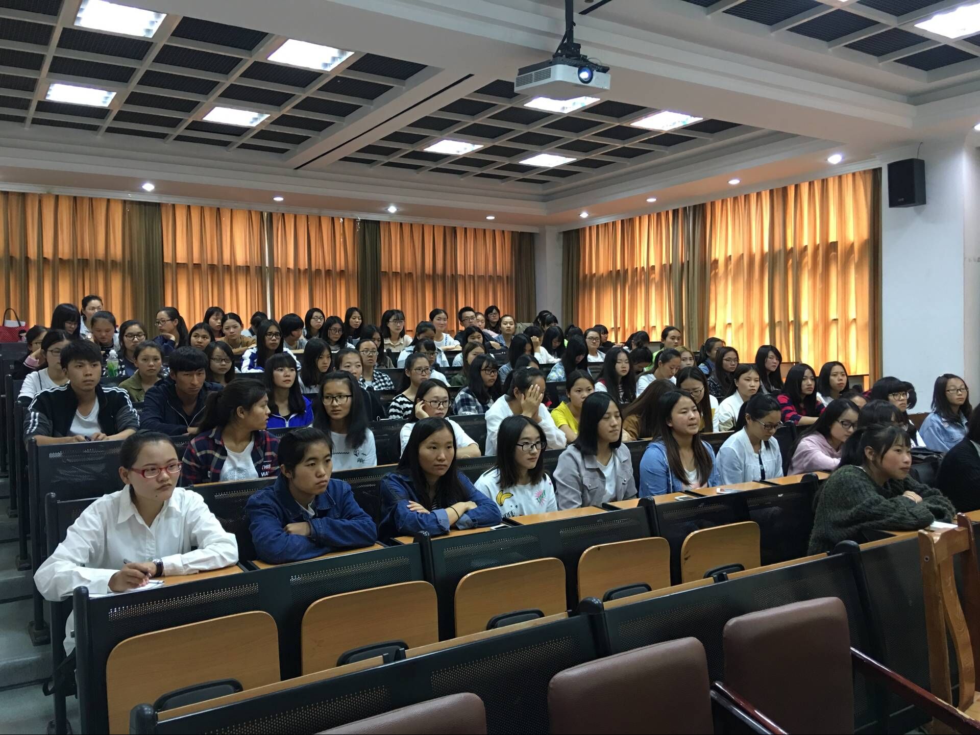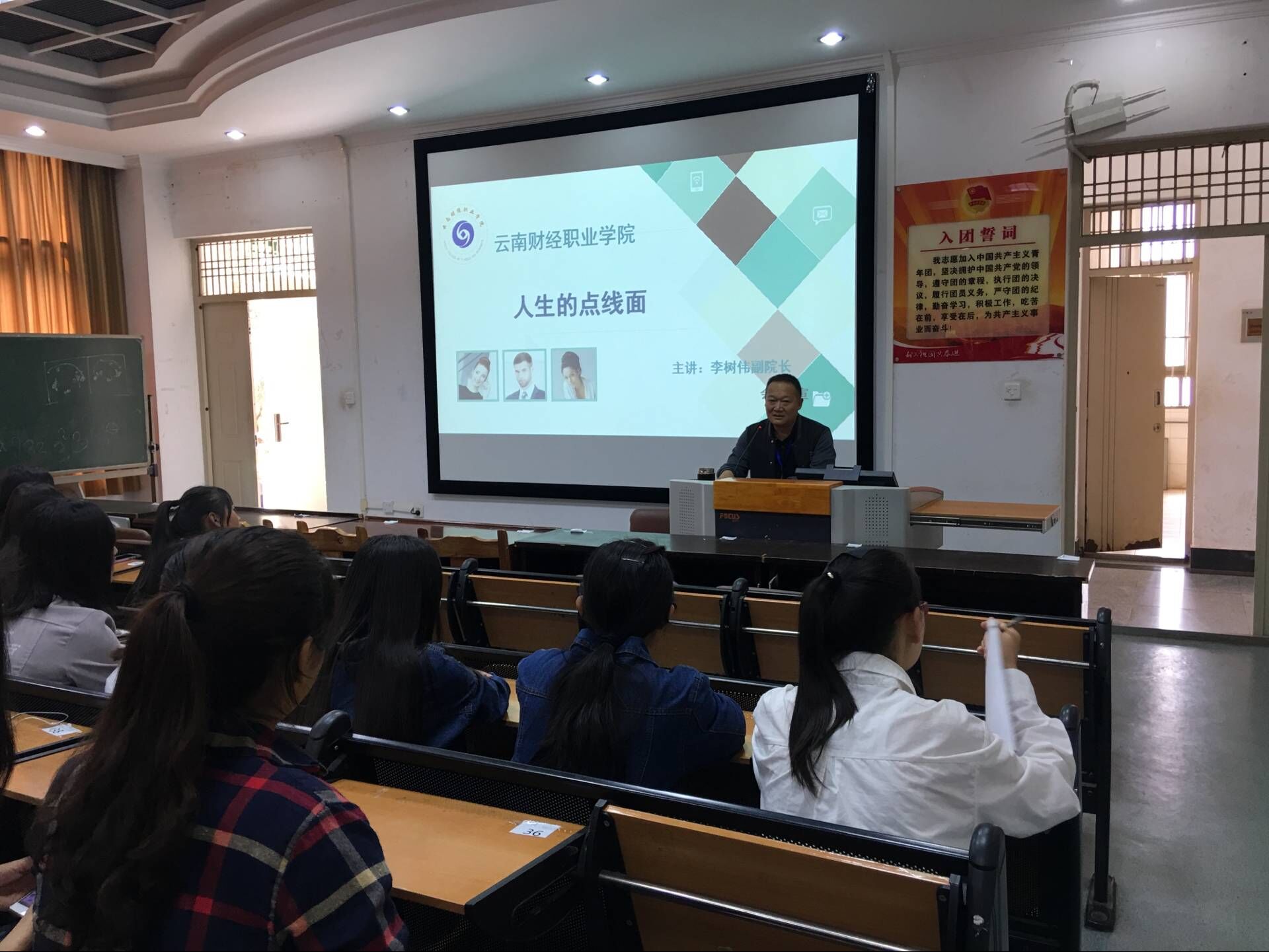 2017年5月26日下午14:30在云南财经职业学院训导楼二楼多媒体教室,会计系邀请学院副院长李树伟老师为系部200多位学生带来了一场精彩的人生哲理讲座——《人生的点线面》。讲座由学院会计系主办,参与此次讲座的老师有会计系主任尹湘萍、党支书杨雯婷以及辅导员张苗苗。讲座中李树伟副院长利用数学点线面的基本概念,论述了知识是点,能力是线,人生是面的观点。