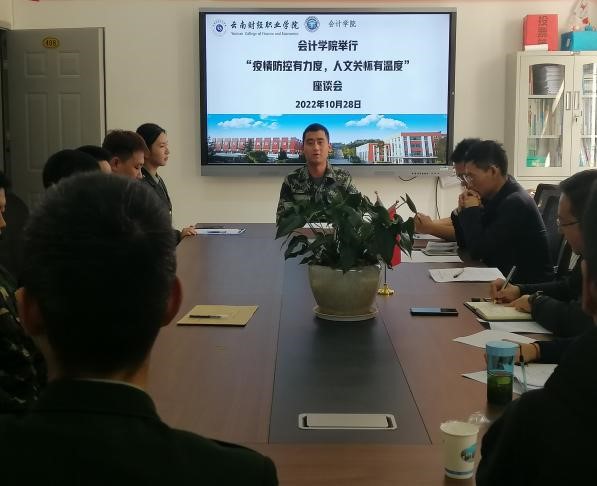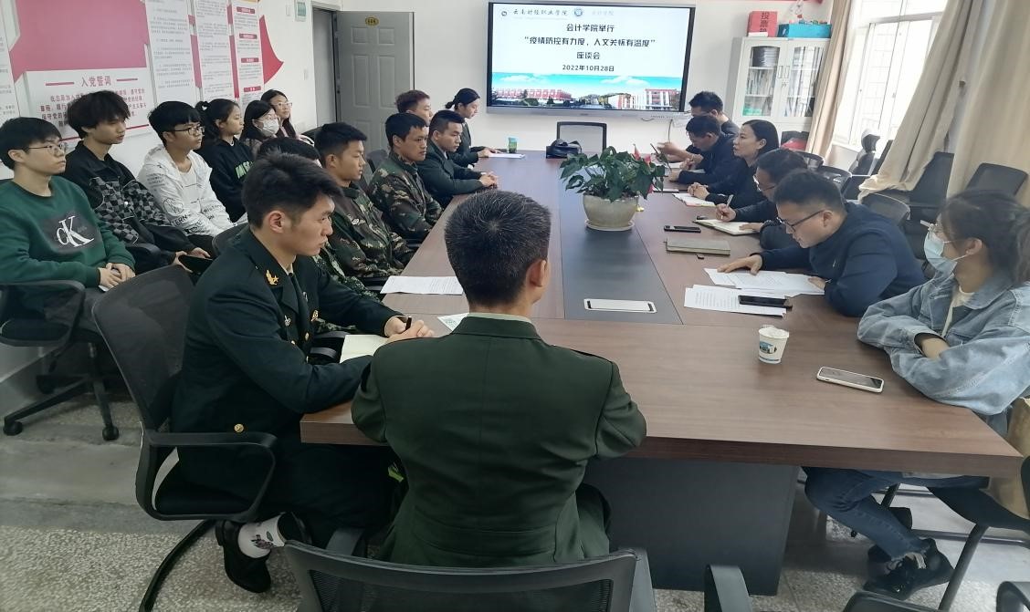 为切实做好对退伍军人以及省外受疫情影响延迟返校学生的关心关爱工作,精准掌握学生动态和实际需求,及时对学生在学习、生活中遇到的问题给予指导和帮助,妥善帮助学生解决实际困难,1028日中午1点会计学院举行 “疫情防控有力度,人文关怀有温度”主题座谈会。会议由会计学院党支部副书记庄秋斌主持。