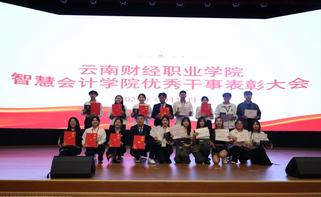 2025年10月19日,云南财经职业学院智慧会计学院2024-2025学年团学工作表彰大会在学院大礼堂隆重召开。本次大会以习近平新时代中国特色社会主义思想为指导,深入学习贯彻党的二十大精神及团十九大部署要求。学院党支部副书记、团总支书记及全体学生代表共同出席,见证先进集体与个人的荣光,凝聚青年学子坚定不移听党话、跟党走的奋进力量。