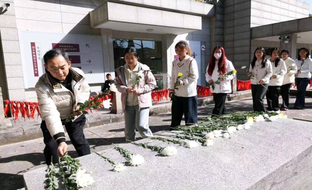 在烈士墓前的广场上,智慧会计学院党支部书记郁军带领全体党员重温入党誓词,以铿锵有力的誓言表达传承革命精神、践行初心使命的坚定决心。随后,党支部全体党员及入党积极分子代表向烈士墓敬献鲜花,师生们肃立默哀,表达对革命先烈的深切缅怀与崇高敬意。