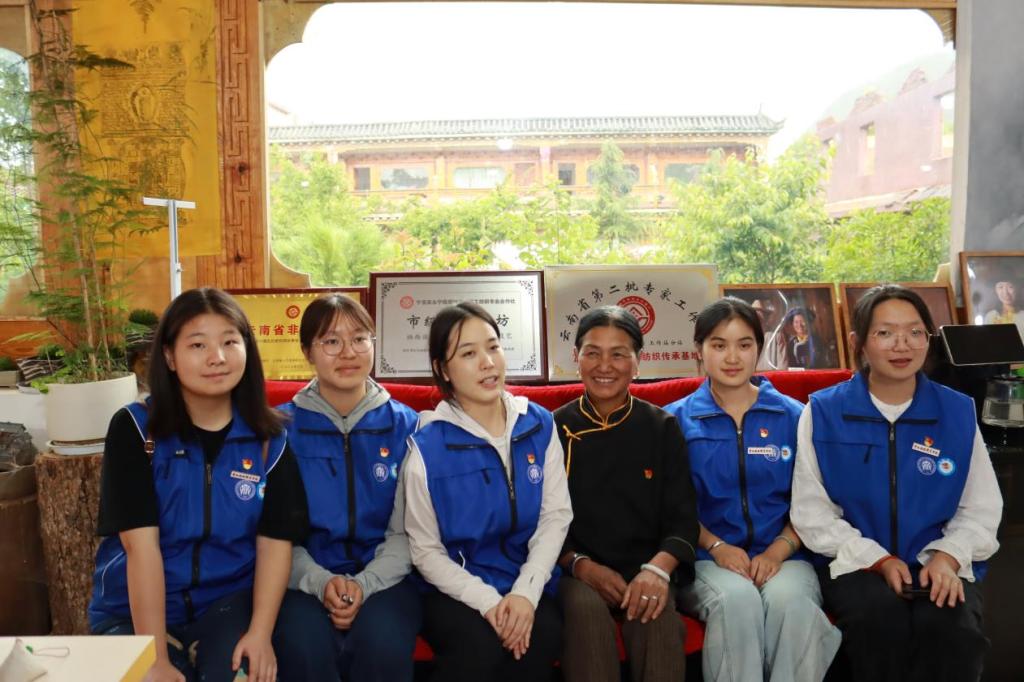 在这里我们遇到一位特殊的"文化引路人"——有长达30年党龄的摩梭非遗传承人阿七独支玛。90年代,她将自家房屋改作非遗传承厂房,免费教授当地妇女纺织技艺;她带领团队注册12项摩梭图腾图案版权,为手工纺织品制定行业规范,改良技术设备、创新纹样设计;积极对接官方资源寻求专利保护,在传统旅游纪念品基础上深挖文化内涵,开拓多元化市场。"非遗传承,文化内涵才是价值所在",阿七独支玛的质朴话语,不仅道出了她坚守30年的传承初心,更通过带动当地妇女就业、促进经济发展的实际行动,书写着民族文化保护与发展的生动篇章。与她的深入交谈,让实践团成员深切感受到摩梭人对本民族文化的赤诚坚守,更读懂了"各美其美,美美与共"的深刻意涵。