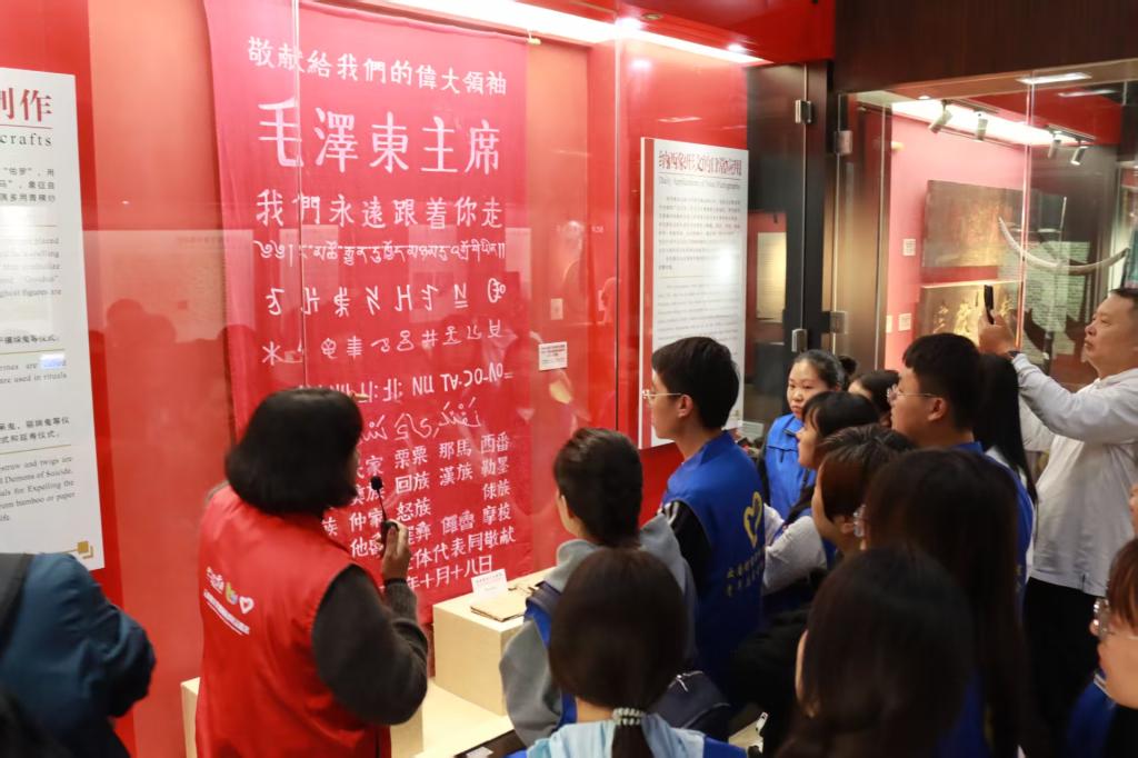 在博物馆内,一面敬献给毛主席的锦旗特别引人注目,上面用汉语和五种民族文字(藏族、彝族、纳西族、傈僳族、回文)书写着“我们永远跟你走”,这段文字凝聚了“中华民族一家亲”的深厚情谊,成为各民族心手相牵的见证。