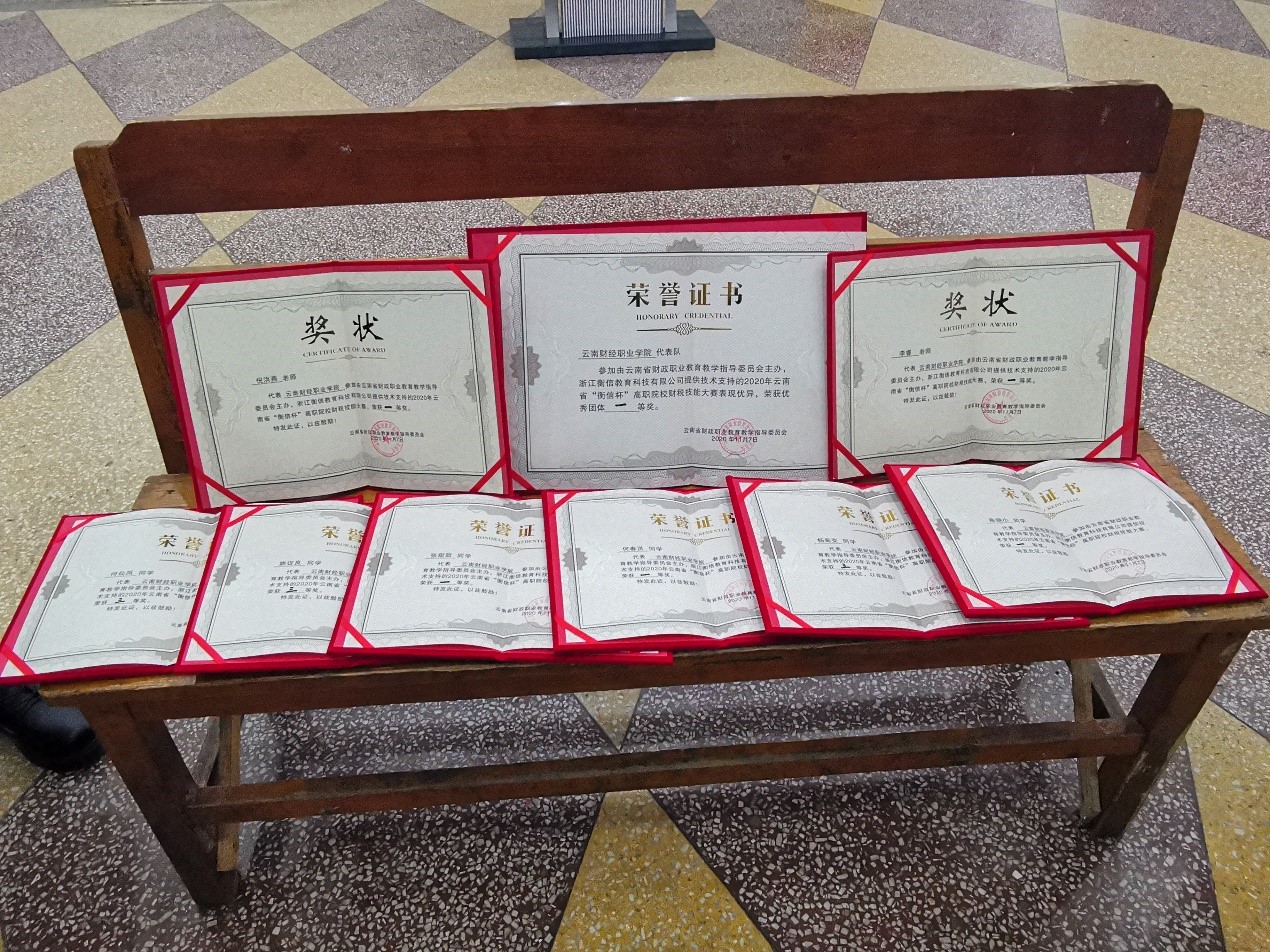 比赛当天,我校六位参赛选手共分为两个小组参加比赛,其中何春洪、张甜甜和陈晓小为第一组选手,姚促良、杨菊变和何仙凤为第二组选手。在经过一个下午紧张激烈地角逐后,选手们取得了令人可喜可贺的成绩,其中:第一组选手以全场最高分第一名的好成绩荣获一等奖;第二组选手荣获三等奖;云南财经职业学院代表队荣获“优秀团体一等奖”