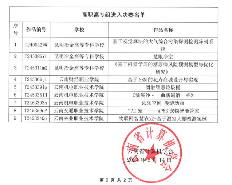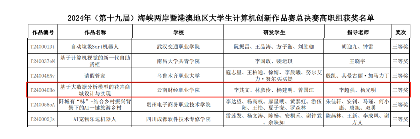 2024年云南省第十二届大学生计算机作品赛(海峡两岸暨港澳地区大学生计算机创新作品赛云南赛区)决赛,于2024年6月16日成功举行。信息工程学院数据安全产业学院参与的《基于SSM的花卉商城》项目荣获一等奖并进入全国总决赛,《非遗灯塔》项目荣获三等奖。