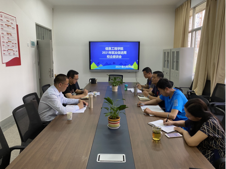 按照《云南财经职业学院就业促进周活动方案》的通知要求,为了落实信息工程学院就业促进周的就业工作,搭建就业平台,促进校企合作,2021年5月20日上午,我院邀请了昆明升顺科技有限公司负责人王国华和云南朗易通信技术有限公司负责人骆丽昆到学院开展交流座谈及专场招聘,地点在财道楼208会议室,信息工程学院书记黎乾坤、院长钟明江、副书记郁军、副院长常云刚以及辅导员杨珍参加了座谈会,会议由院长钟明江主持。