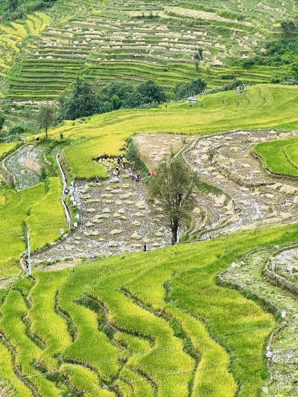 这个时候到撒马坝梯田闲暇,正是美好季节的最佳选择。满怀着对大自然美好的憧憬、对山水和撒马坝梯田的情怀,沿着小道边走边看,沿途都是金灿灿的稻谷,放眼望去,到处是撒马坝梯田一派丰收的景象。加上四周富有诗意的树林、山寨,一片片、一块块,千姿百态,构成一幅幅美丽的画卷。