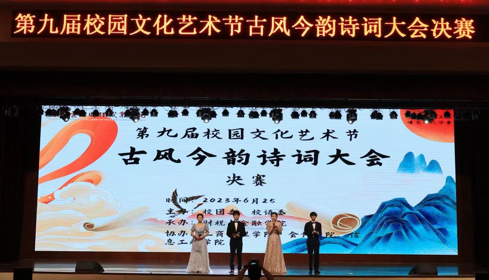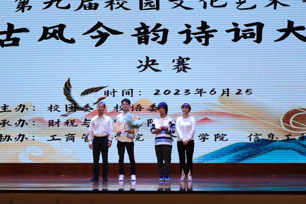 为了弘扬中华优秀传统文化,感受中华文明的璀璨辉煌,品味诗意人生,坚定文化自信,担当历史使命。2023年6月25日学校财税与金融学院以学习贯彻习近平新时代中国特色社会主义思想主题教育为契机,举办了第九届校园文化艺术节“古风今韵”诗词大会决赛。决赛部分由马克思主义学院杨冉老师主持。学校党委委员副书记仲新、纪委书记马家巍出席大会,学工部部长、校团委及各学院(院部)的党支部书记、院长、团总支书记到场指导,全校600多名学生到现场观赛。