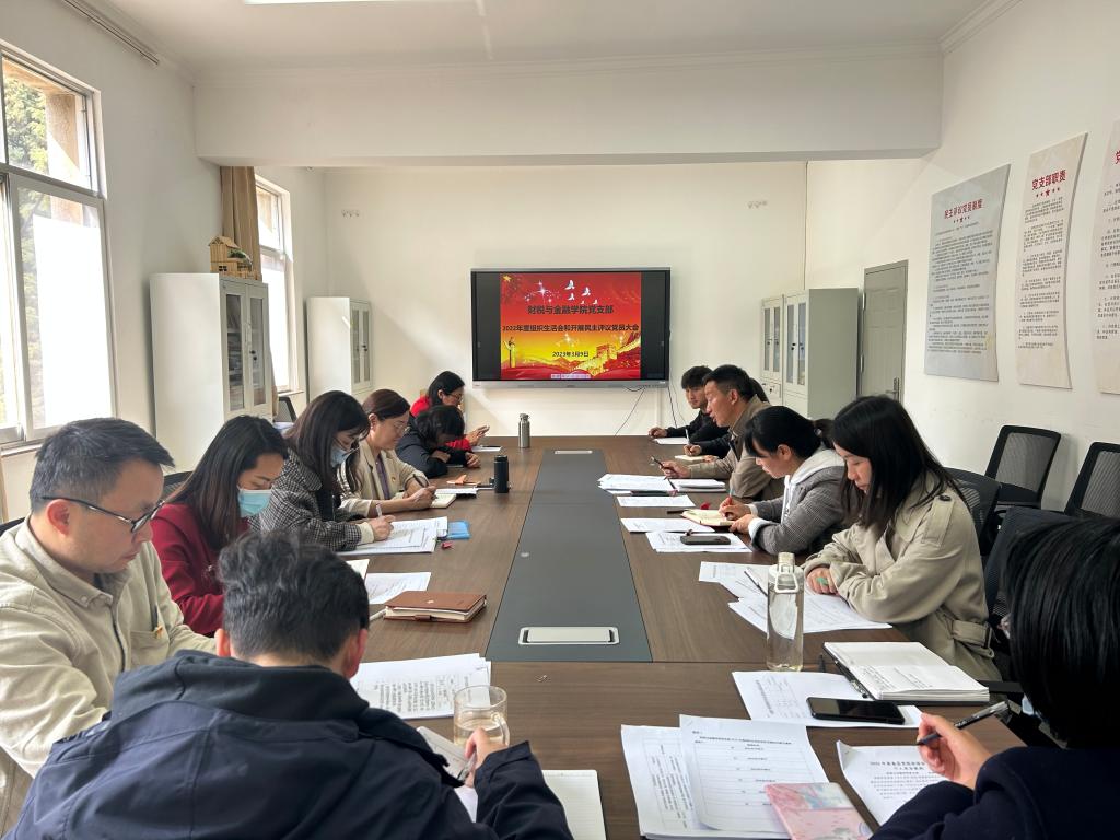 根据学校党委《关于召开2022年度基层党组织组织生活会和开展民主评议党员的通知》要求,财税与金融学院党支部第一时间进行动员部署,统筹工作安排,结合支部工作实际,在充分准备的基础上,制定具体方案,于2023年3月9日15点在敬德楼510会议室召开2022年度组织生活会和民主评议党员大会。会议由党支部书记罗勇同志主持,支部10名正式党员和2名预备党员参加了会议。学校党委委员、副校长沈豫琼同志和组织部司娜同志进行现场指导监督。