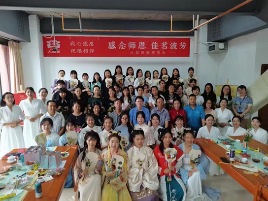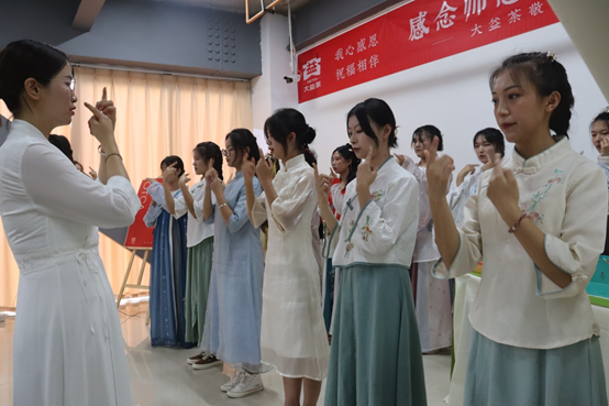 会上工作人员讲解了普洱茶的对人体的各项功效及益处,表演了大益八式茶道,带领全体同学表演手势舞“感恩的心”。每一位老师为同学书写寄语卡,同学也为老师书写了感恩卡,茶艺社及汉服社的同学为感谢师恩向老师进行了中国传统的谢师仪式。本次活动得到了云南大益茶叶集团昆明翠湖茶会专营店的大力协助。