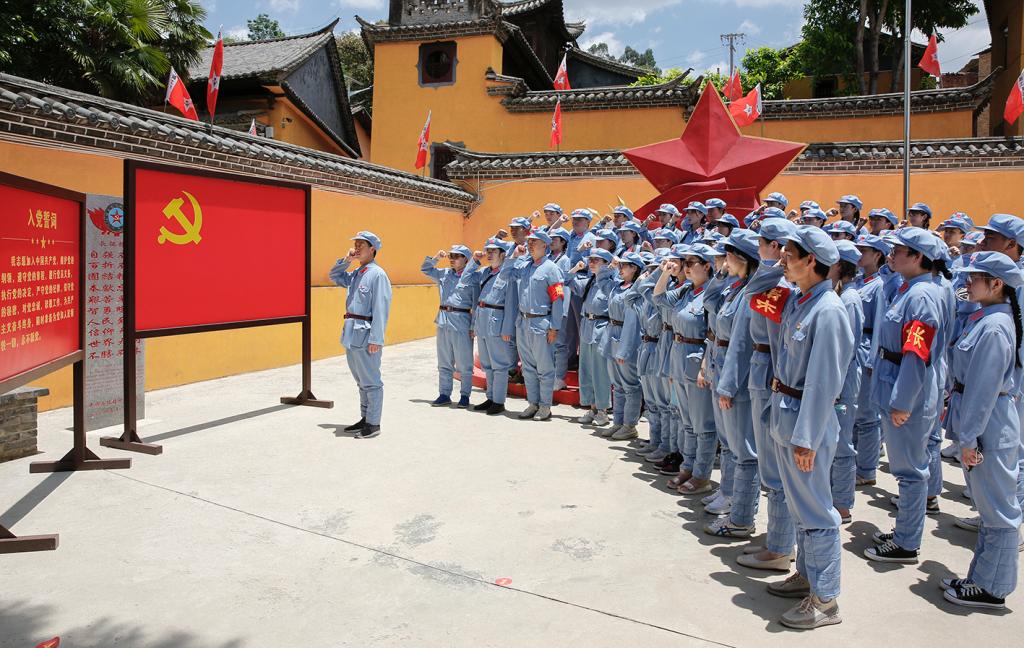 在中央红军总部驻地旧址大院内,由学校党委副书记仲新同志领誓,全体党员面对党旗,举起右手,重温入党誓词。
