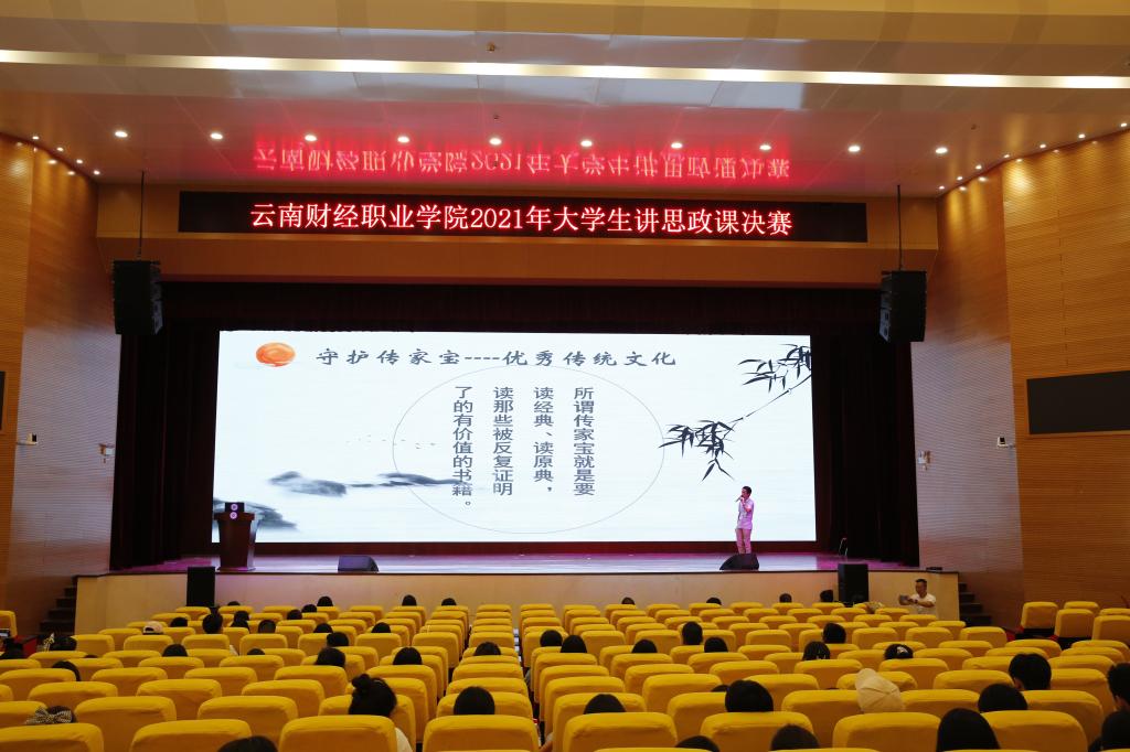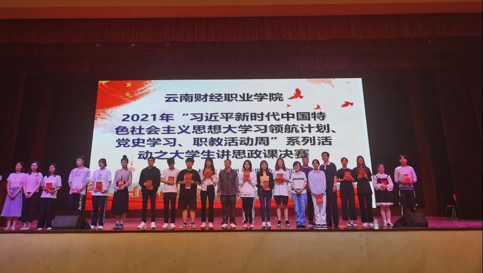 为庆祝中国共产党成立100周年,深入贯彻落实习近平总书记关于深化思想政治理论课改革创新和加强“四史”教育的重要指示精神,展现财职学子积极向上的精神风貌和德智体美全面发展的素质风采。云南财经职业学院2021年“习近平新时代中国特色社会主义思想大学习领航计划、党史学习、职教活动周”系列活动之大学生讲思政课决赛于5月28日下午在学校大礼堂圆满落下帷幕。