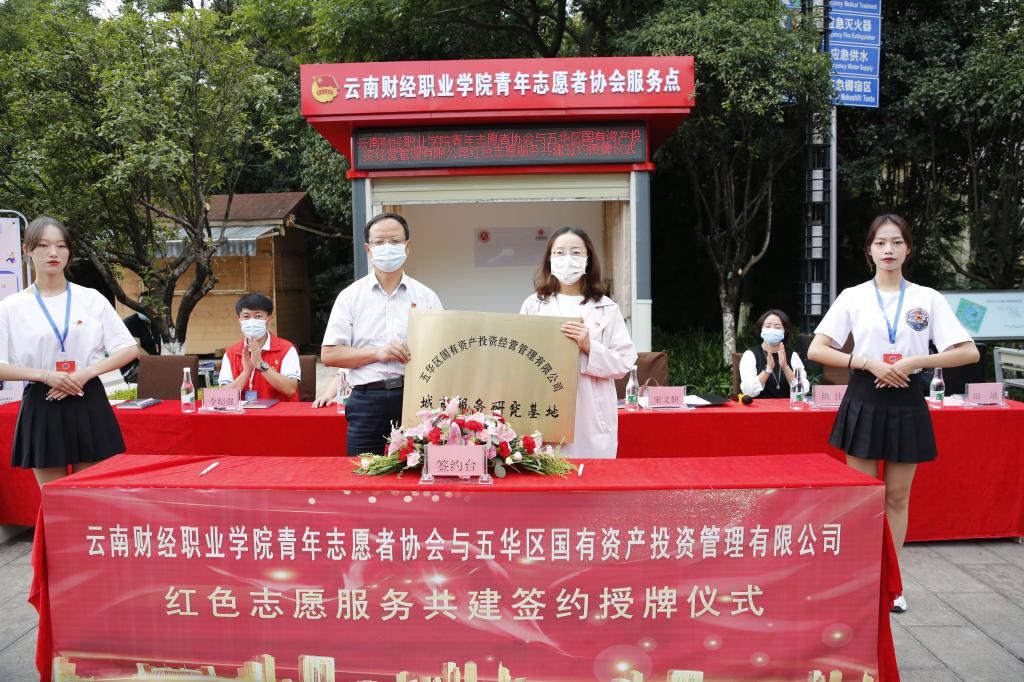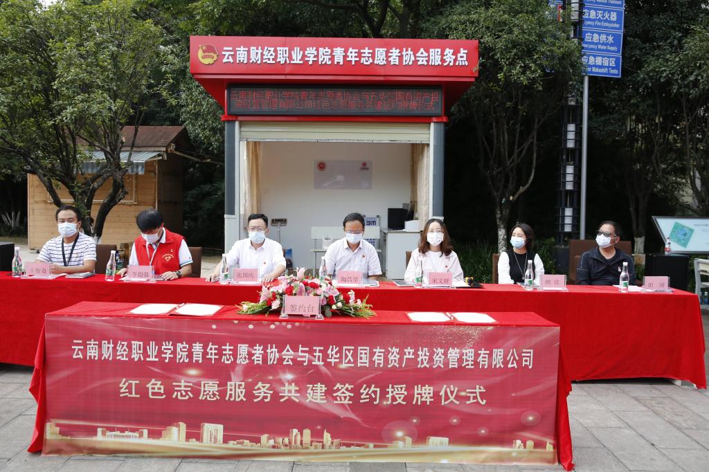 为深入贯彻落实习近平新时代中国特色社会主义思想,贯彻落实党的十九大和十九届二中、三中、四中、五中全会和习近平总书记“七一”讲话精神,积极培育和践行社会主义核心价值观,大力弘扬“奉献、友爱、互助、进步”的志愿精神,根据省、市推进爱国卫生“7个专项行动”和各类争创专项活动相关工作部署,切实落实《五华区国企党建工作“一企一策”建设和“一企一品牌”创建实施方案》,云南财经职业学院与五华区国有资产投资经营管理有限公司于9月16日在月牙潭公园举行红色志愿服务共建签约授牌仪式,党委副书记、校长陶昌学同志、相关职能部门负责人、教师代表、青年学生志愿者和五华区国投公司领导参加活动。