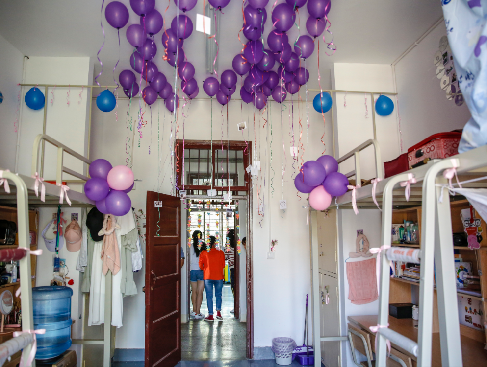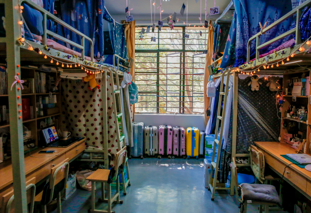 同学们充分发挥自己才能和想象力,对自己的宿舍进行精心装饰。有的寝室在空白单调的墙上贴满了自己与舍友的亲密照,照片上满满的都洋溢着青春的气息,青春靓丽的照片瞬间就将整个寝室装点得充满活力,让人走进去后心里顿时充满阳光,会不自觉的露出笑容;有的同学在寝室摆放一个花架,上面放上自己种植的多肉和小花,使沁人心脾的花香与可爱的多肉相结合,在墙壁上装饰自己纯手工制作的或绿色或青色的装饰品,视觉与嗅觉相互搭配着使整个寝室都充满大自然的气息,让人进入其中就仿佛走入大自然般舒畅自在;还有一些寝室将自己手工制作的手工作品挂在天花板上或是贴在墙上,让人眼前一亮。