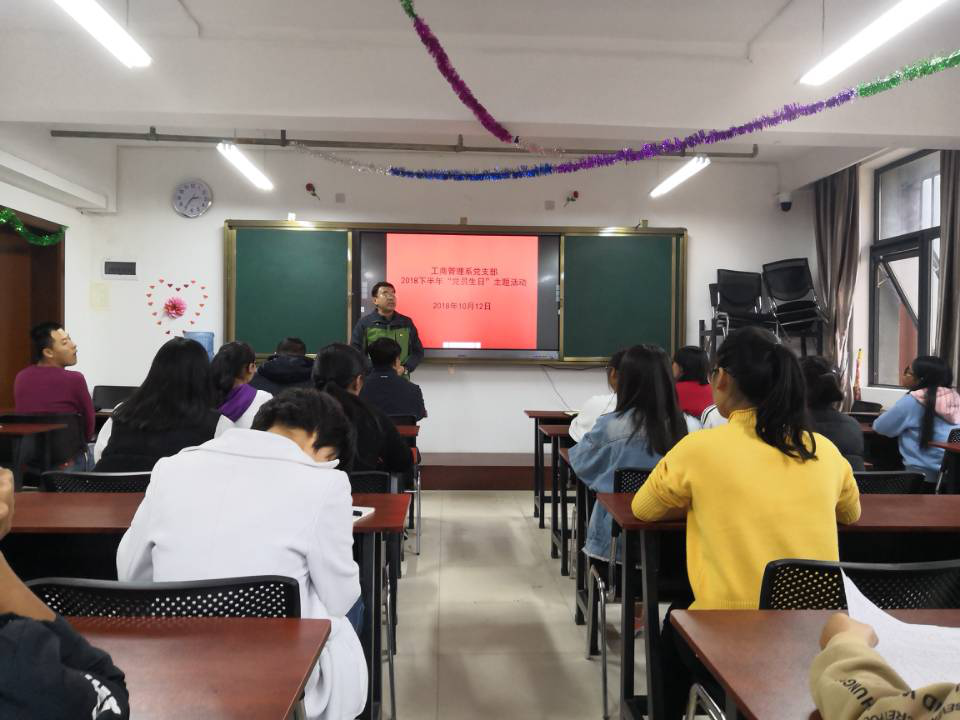 2018年10月12日下午2:30分,工商管理系全体党员在财欣楼3楼教室,举行 “党员生日”主题活动,工商管理系全体党员和大学生入党积极分子共计50人参加此次活动。