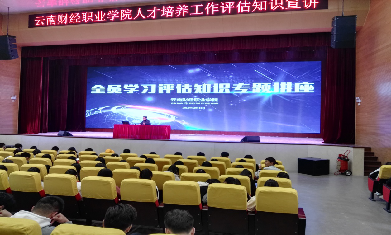 2108年10月11日下午2:30分,工商系全体学生在系党支部书记、班主任和辅导员带领下,在学院礼堂参加学院人才培养工作评估知识专题讲座。