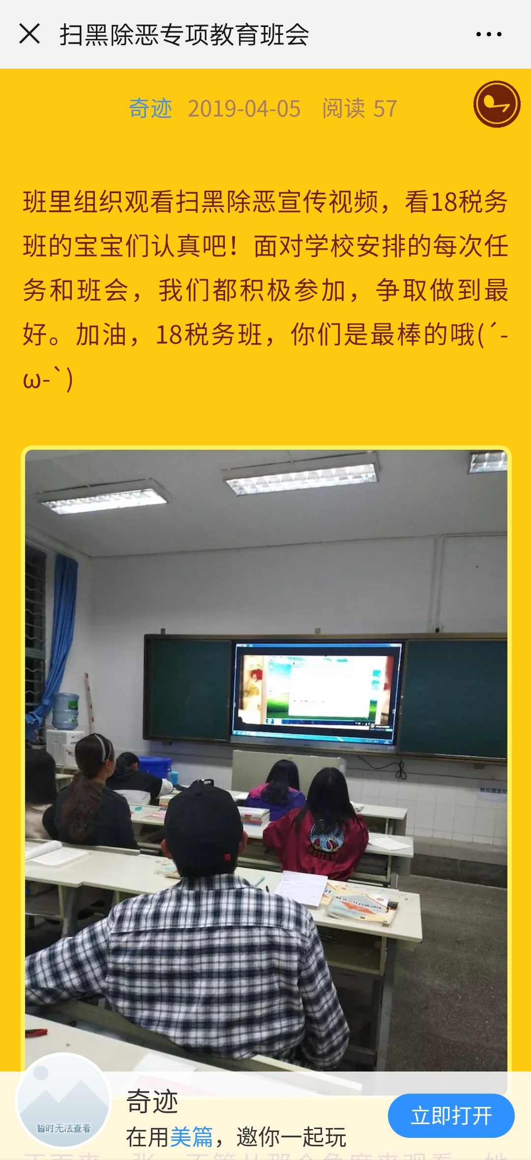 3、各班观看扫黑除恶及防诈骗宣传片。18级税务班同学还将扫黑除恶主题班会制作成美篇,加大了活动宣传力度。