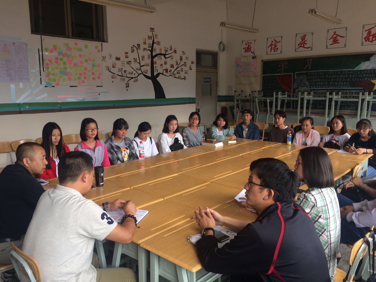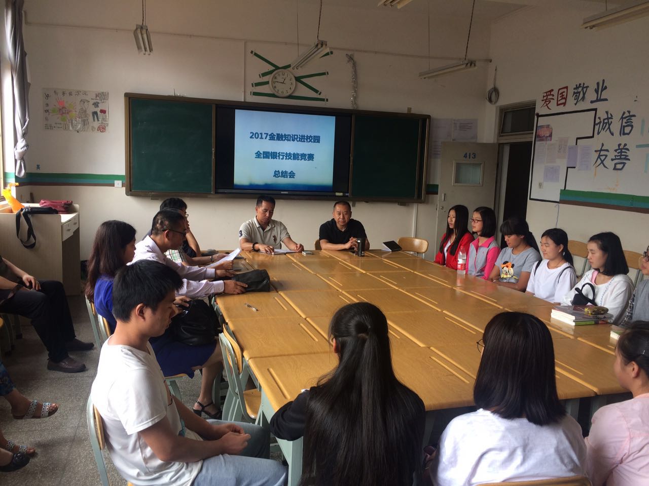2017年6月22日中午,财税金融系在教学楼413教室召开了“2017年金融知识进校园”和“全国银行技能竞赛”总结会。参加此次会议的有财税金融系主任李贵勇、支部书记韩杰、金融保险教研室主任闫寒、税务教研室主任孔菊丽、投资理财教研室主任王晓天以及相关老师和学生。会议由李贵勇主任主持。