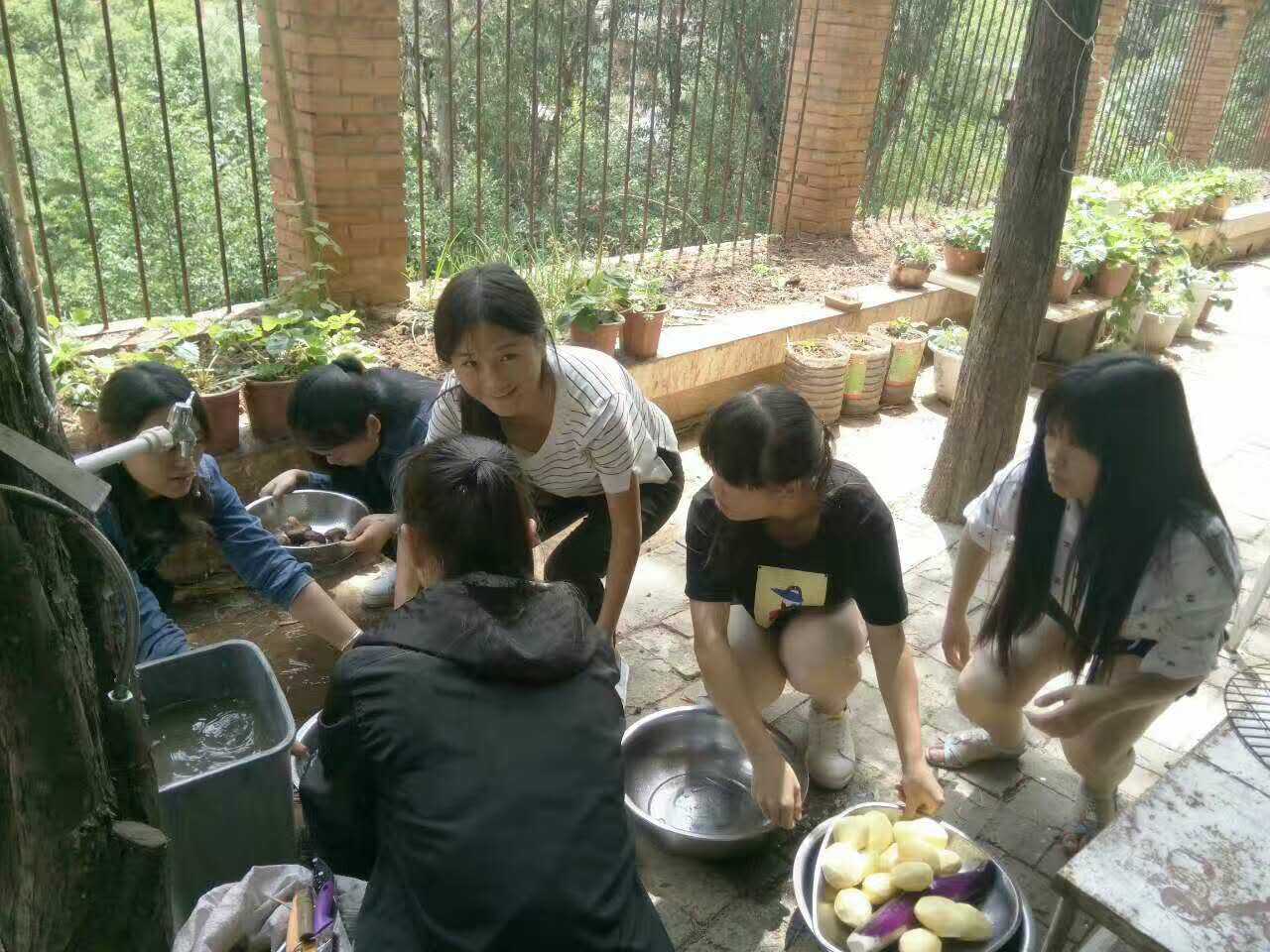 洗菜、切菜,同学们各显身手,做自己会做的,桌面上的各种美食琳琅满目,经过大家团结协作,一顿大餐即将开始。