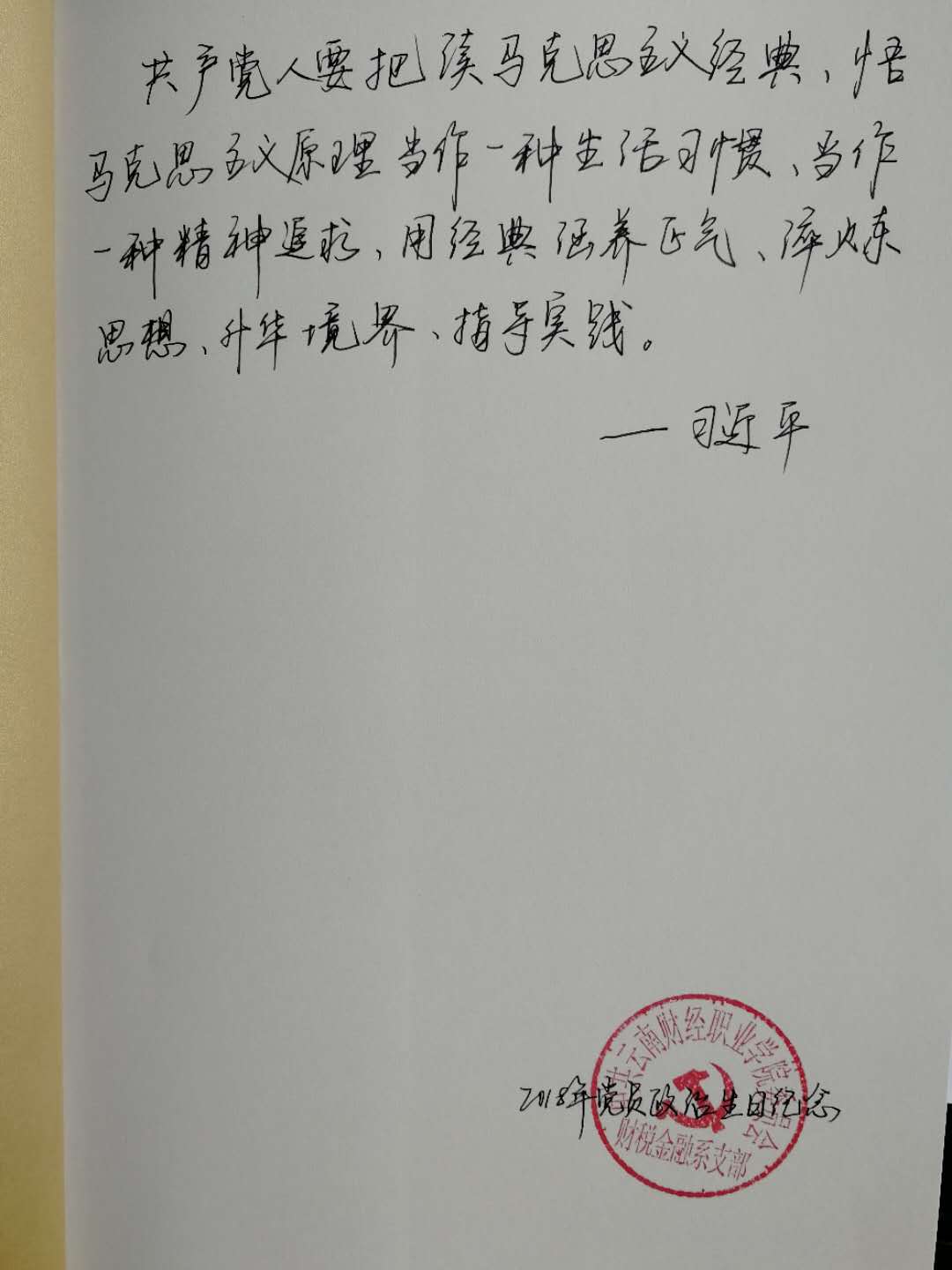 活动中我们首先学习了习近平同志在纪念马克思诞辰200周年纪念大会上的重要讲话,特别结合支部党员都是政治工作者的实际,认真品味了文中“共产党人要把读马克思主义经典,悟马克思主义原理当作一种生活习惯,当作一种精神追求,用经典涵养正气、淬炼思想、升华境界、指导实践”。活动为每名党员准备了一份政治生日礼物——《共产党宣言》,从中感悟我们的信仰之源,重温我们的入党初心。