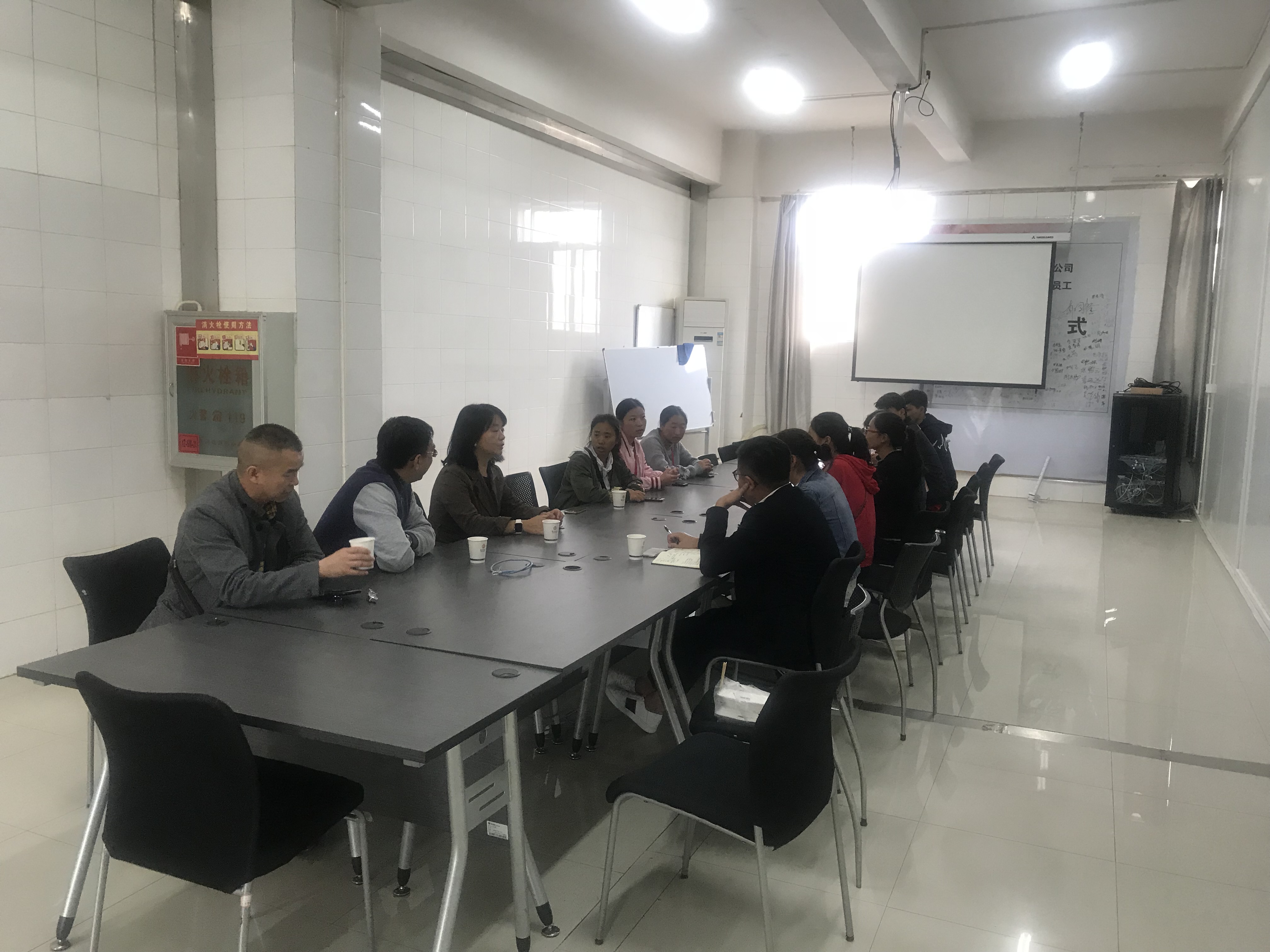 在参观了毕业实习同学的工作环境后,组织了座谈会。嘉华食品公司沈经理向三位老师介绍了实习生管理、实习工作情况,对到企业实习的10位学生的表现给予了很高评价。嘉华公司认为实习学生理论基础扎实,素质教育水平高,在平时的学习和工作中踏实肯干,能认真完成企业交给的工作任务。石彬老师代表学院对嘉华食品公司长期给予我校教学实习工作的大力支持表示衷心感谢。三位老师详细了解了实习生的学习、生活和工作情况,针对实习生的毕业规划给予了详细的指导。