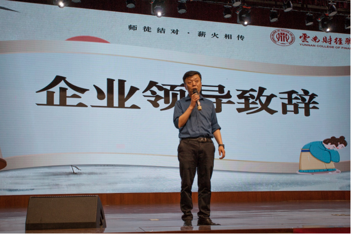 践行工匠精神,根植校企育人。为进一步深化产教融合,优化人才培养模式,推动“双高”专业群建设,4月29日,云南财经职业学院数字商学院-电子商务专业“现代学徒制师徒对接仪式”在大礼堂隆重举行。校教务处处长李爽老师、数字商学院党支部书记贺鹏老师、数字商学院院长李中京老师、武汉京云创新科技有限公司领导姜涛老师与10名企业专业导师,以及2023级电子商务专业的100余名学子出席本次仪式。