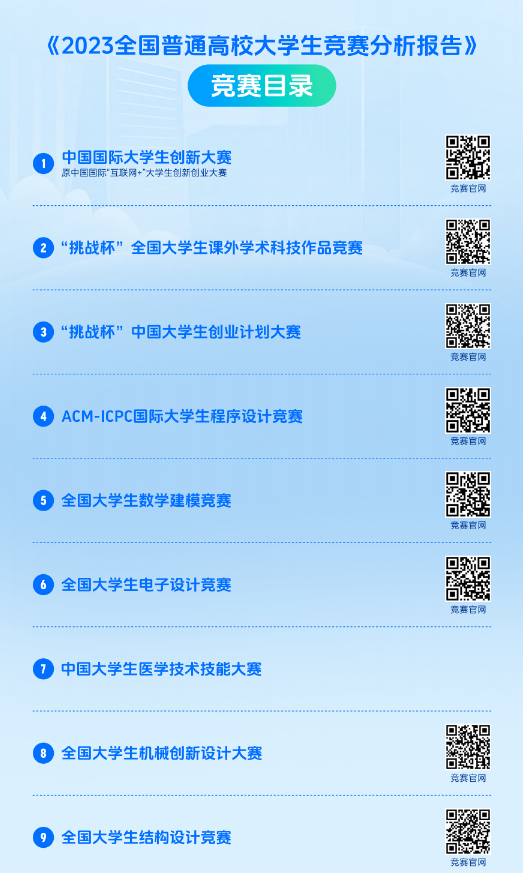 2024年3月22日,中国高等教育学会高校竞赛评估与管理体系研究专家工作组发布《2023全国普通高校大学生竞赛分析报告》,其中包含普通本科院校大学生竞赛榜单13个、高职院校大学生竞赛榜单11个、省份大学生竞赛榜单3个。最新的84项全国普通高校学科竞赛的排行榜也同时发布。